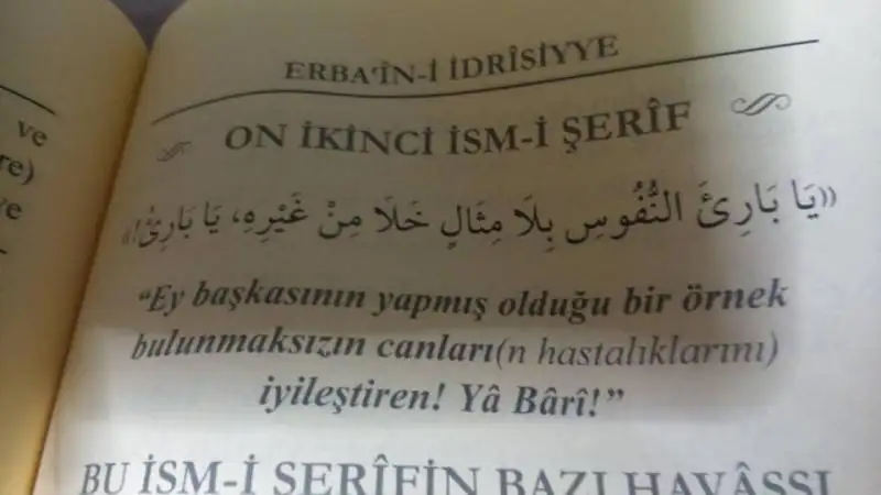 Yalnız dikkate alınsın içinde allahın isimleri var tesiri kuvvetli ve başladım mı bırakılması yanlış.Arapçasını okuyamayanlar içn: Yaa baariennufuusi bilaa misaali halaa min ğayrihi,yaa baariü.bu dualar idris aleyhisselama indirilen 40 ismi şeriftendir.