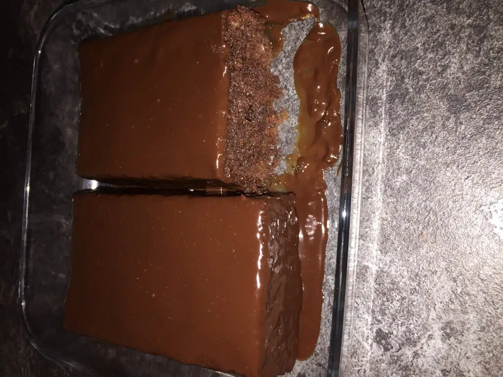 Normal kek hamuru yapıp baton kalıba doktum cıkınca ters cevırıp( ben gordugun kaba sıgsın dıye ıkıye kestım ortadan) ustune bır cay bardagı kadar sıvı kremayı ısıtıp kaynamadan kapattım ıcıne 100 gr bıtter cıko erıtıp pastanın uzerıne surdum..