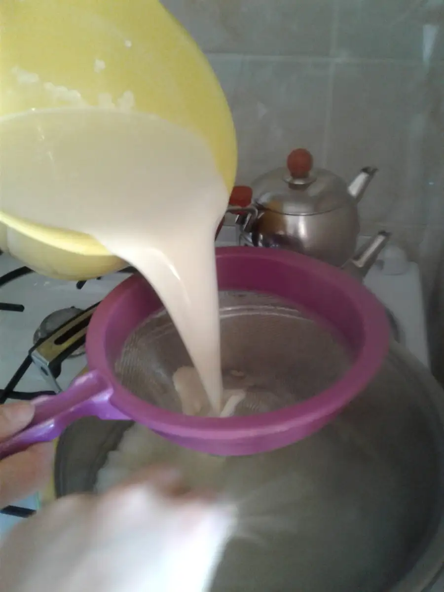 3 su bardağı suyu bir miktar tuz ike ocağa koyup kaynatalım. Başka bir yerde 2 su bardağı suya 1 su bardağı unu koyup çırpıcı ile topaklaşma olmayacak şekilde karıştıralım.