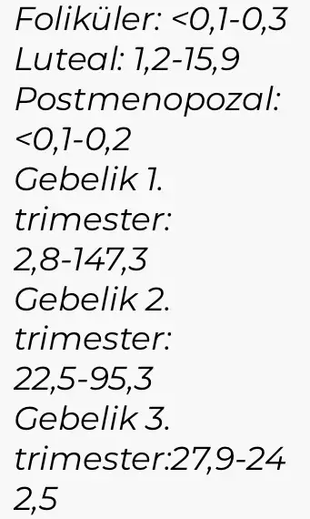 Benim de ilk transferim bu sebepten iptal olmuştu değer 2,76 idi. Sizin rakam biraz uçuk açıkçası. Progesteron referans aralığı benim tahlilimde şöyle gözüküyorBenim transfer öncesi progestoron hormonu 22 çıkmış çok yüksek dediler iptal ettiler transferi kaç olması gerekir dedim 1.30 dediler.