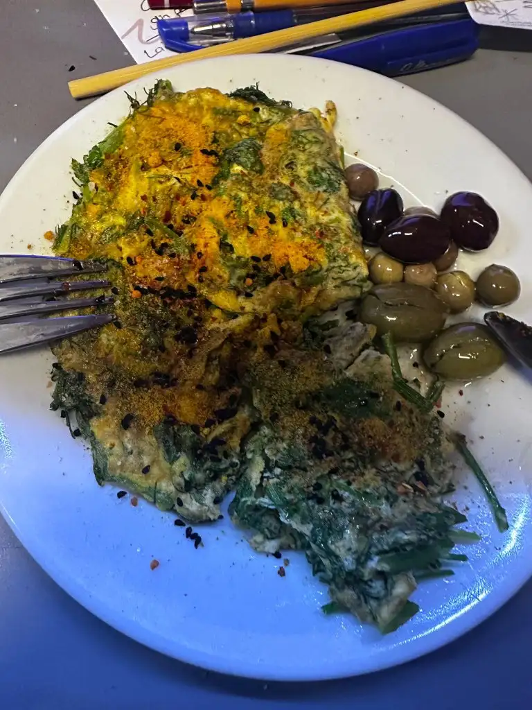 Omlet , 1 dilim tbe, 1 dilim peynir, yeşillik, 5-6 zeytin, 5-6 fındık