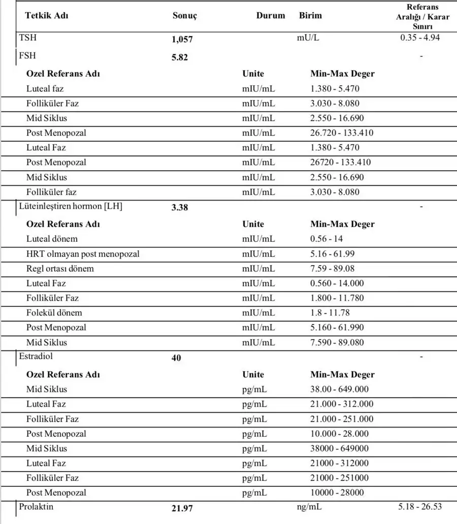 Benim 44 tü canım. 21 normal gibi ama bilemedim de şimdiKızlar bir de bir şey soracağım bu prolaktini yüksek çıkanlar sizin kaç çıkmıştı? Benim 21 çıktı doktor özel olarak onunla ilgili bir şey demedi. 3.gün ve 21.gün hormonlarını yaptırmıştım genel konuştu yumurtalıkların çalışıyor sonuçların iyi sadce tüpler açık mı onu bilemeyiz. Ona da 1 yıl denedikten sonra olmazsa gel dedi. Ama bu prolaktin 21 olması kafamı karıştırdı bazı yerlerde yüksek diye okudum çünkü.( Hatta 21.97 çıkmış 22 sayılır yani)