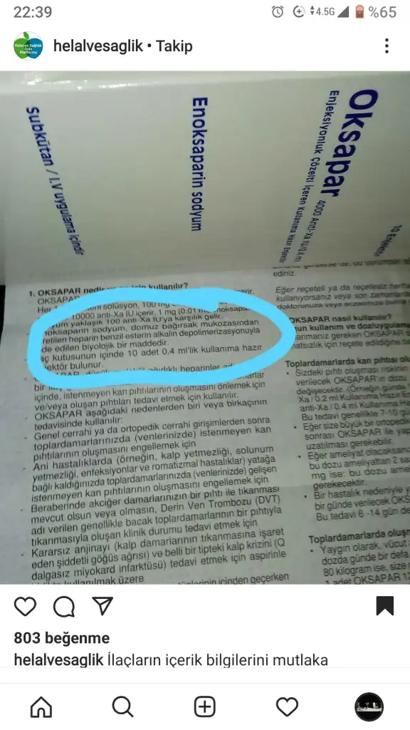 Kızlarr birşeyler duymuştum da bugün denk geldik. Haberiniz olsun..bu oksapar kan sulandırıcı değil miydi ? Tedavi olan arkadaşlar isterseniz domtor bunu yazarsa alternatif başka ilaç talep edin. Domuz içeriğini kullanmayın. Eki Görüntüle 2883871