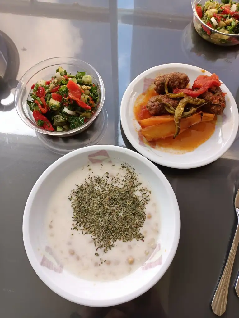 İkinci ogunum. Bir kepçe kadar yarma çorbası, İzmir köfte, köz salata...(Patatesleri yemedim.)