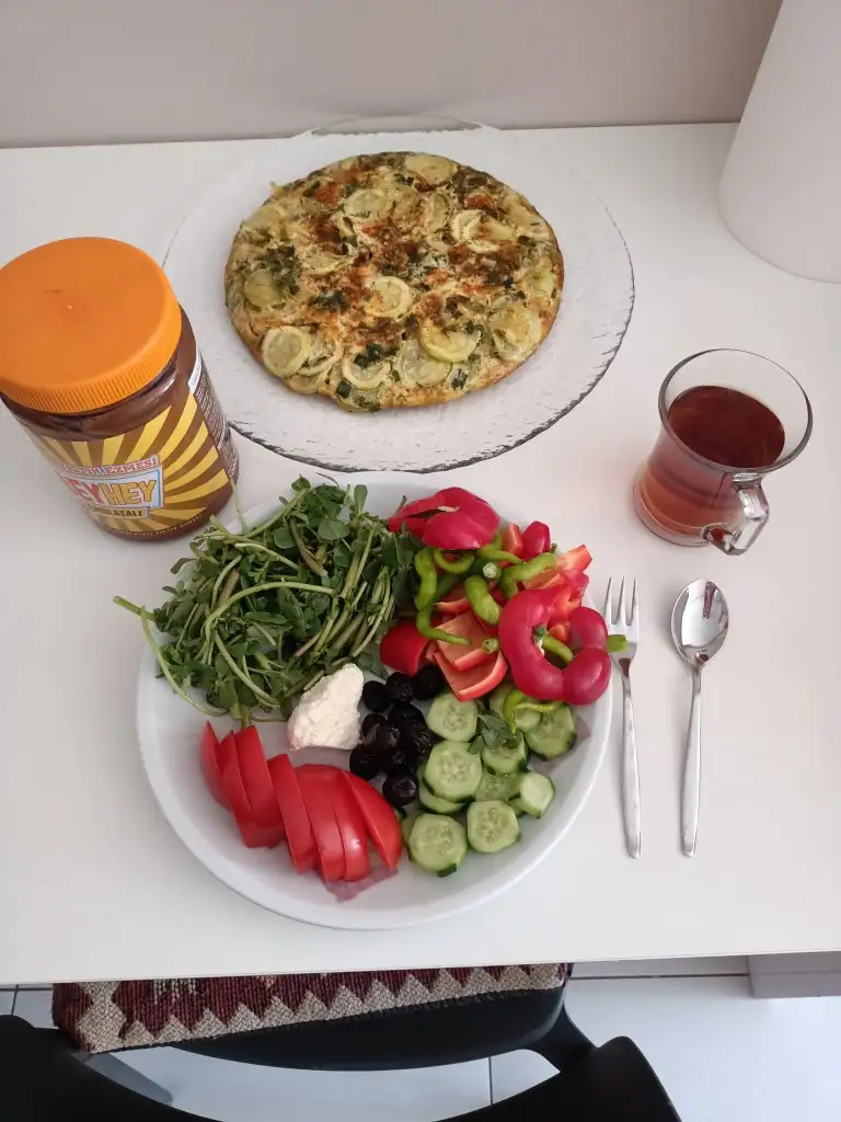 Günün ilk ve tek öğünü. Kabaklı omlet böreği. 😋🥰Bir adet de şeftali yedim, kahve yanında da 10 Gr %85 kakaolu bitter çikolata..
