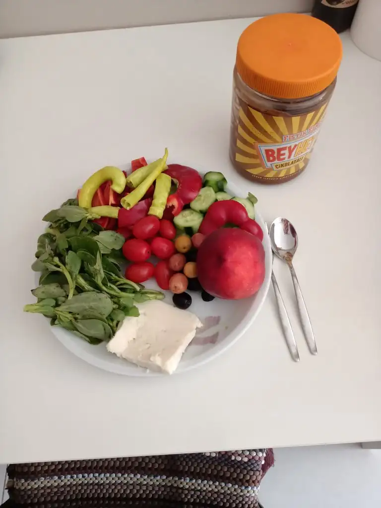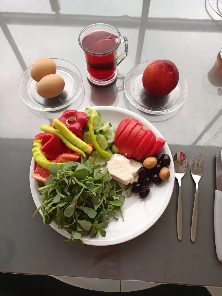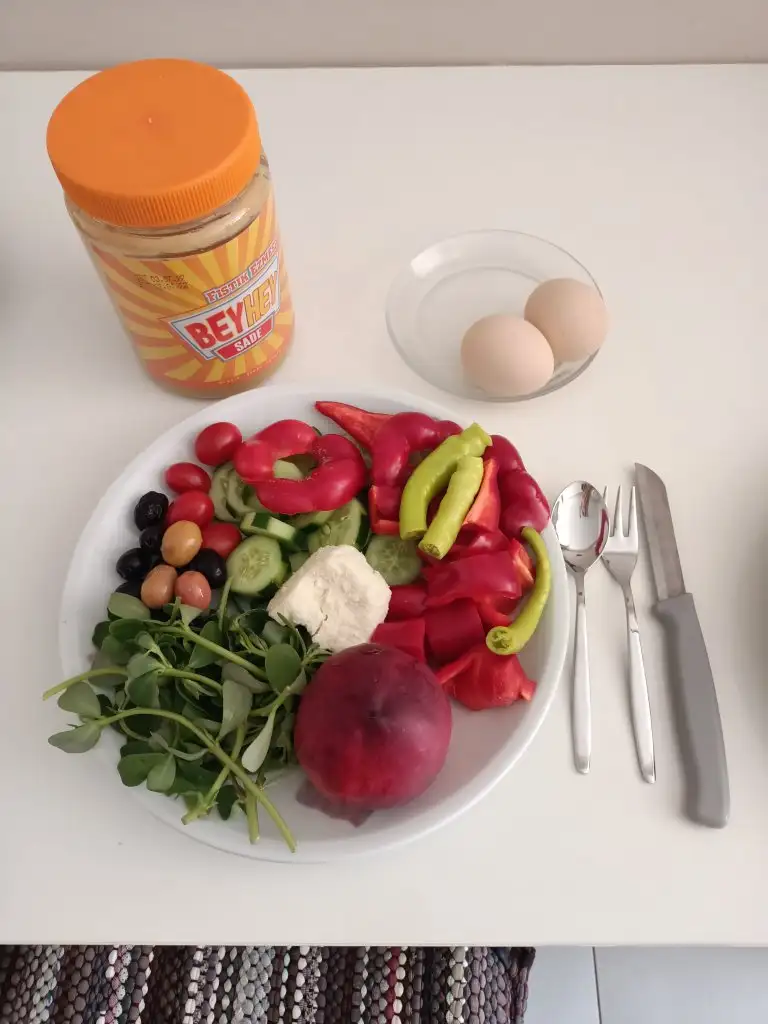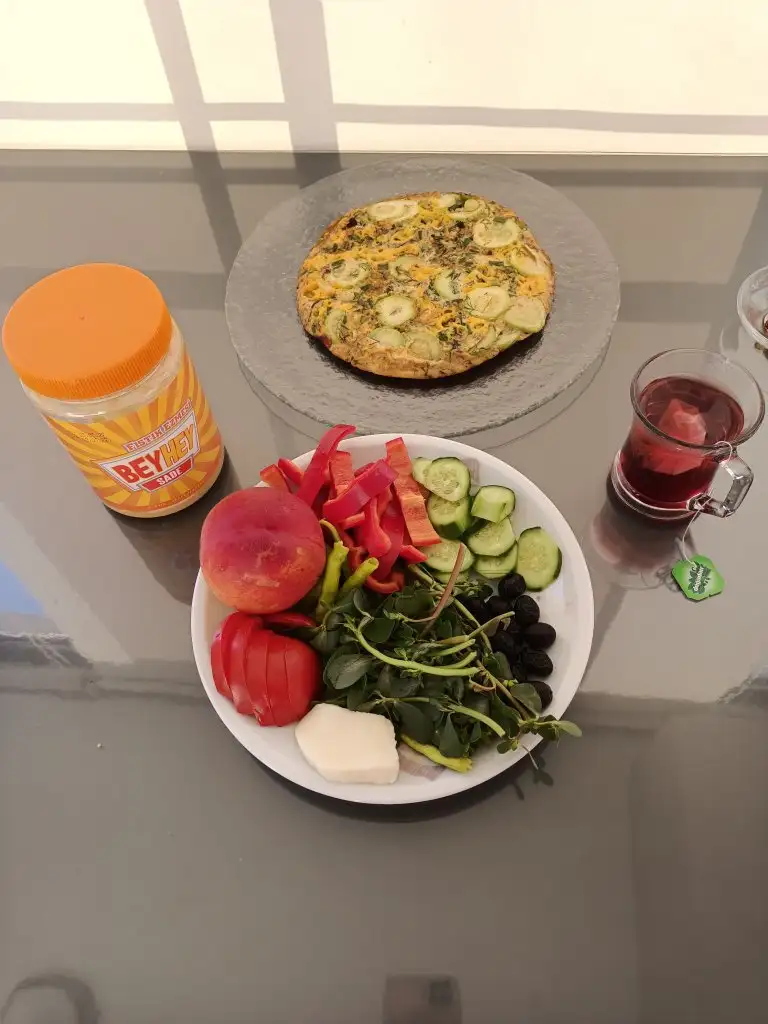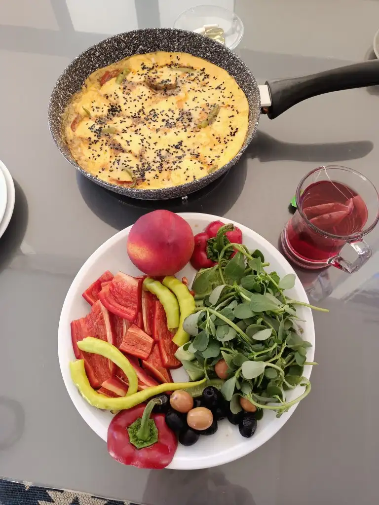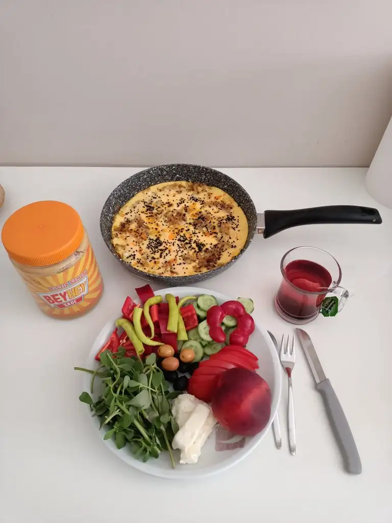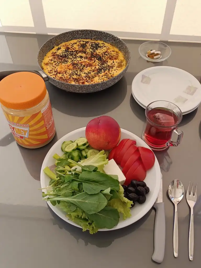 23 saatlik açlıktan sonraki ilk öğünüm. Domatesli, biberli ve kaşarlı omlet. Kahve yanında da bitter yedim.