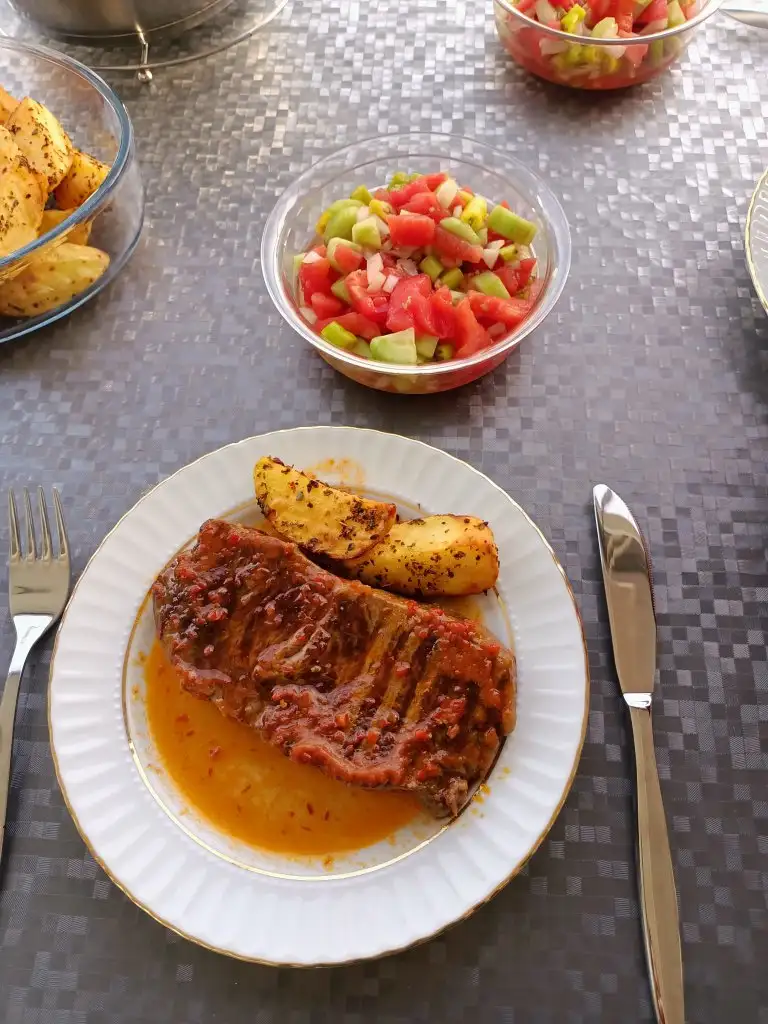 Patates airfryer'da az z.yagi ile pisti. Tabi ki yine minik bir patatesin yarısını yedim. Salatam da bol sirkeli....🤤