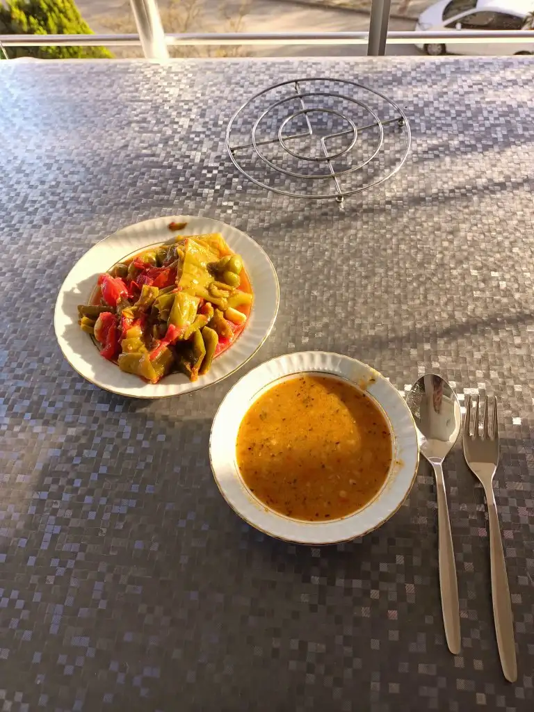 Ezogelin çorbası, domatesli köy biber kavurması ( çok az yağla, airfryer'da), 30 Gr kadar da hindi füme yedim.