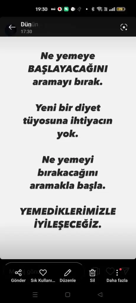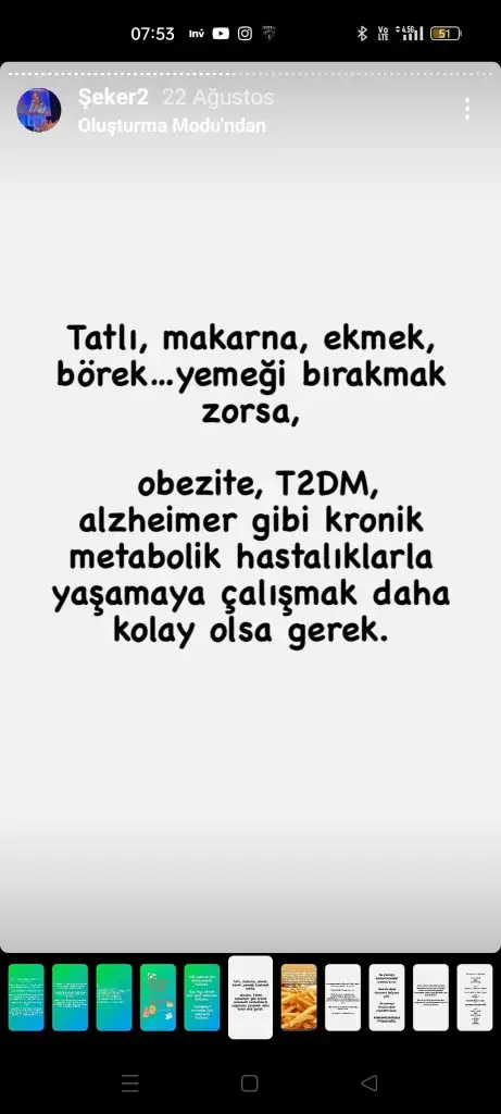 Bunları duyduğuma sevindim süper olmuş çok güzel beslenmissin. Yavaş yavaş rayına oturacak herşey .kek yok tatlı birşey yok Şimdiye kadar yediklerimize sayalım nasıl olsa tatlarını biliyoruz zamanla o istekte körelecek emin ol.Bir demlik çayı şekerle içerken şekersiz içenlere o nasıl birşey nasıl şekersiz icebiliyorsunuz o tatsız tuzsuz birşey olur diyordum .Yıllar oldu bir bardak şekerli çay içmedim .Şeker koymak aklıma bile gelmiyor mesela .Merhabalar, sabah 1,5 yumurta muhammara zeytin peynir domates salatalık ve 2 dilim siyez ekmeği yedim. Kahvaltıdan yarım saat önce de sirkeli suyumu içmiştim. (9.00 kahvaltı saati)
