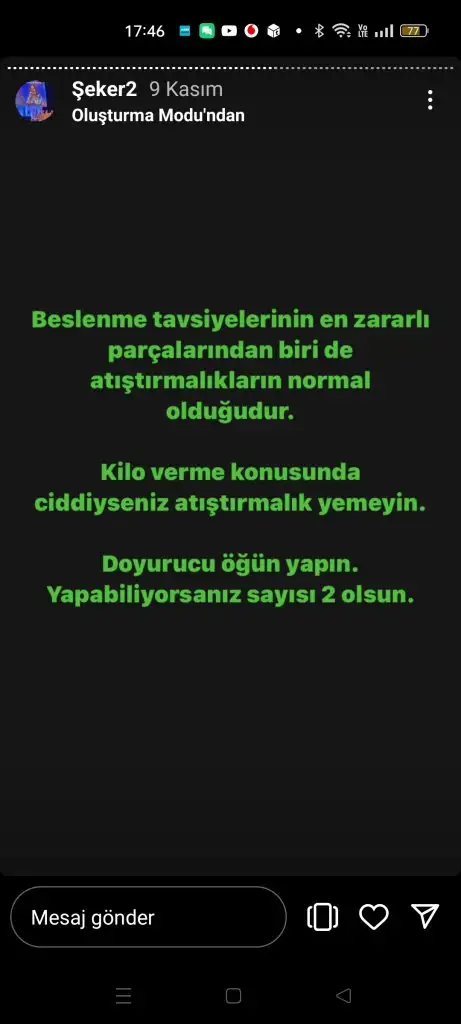 Yavaş yavaş oda olacak gayet güzel gidiyorsunGünaydın, ben dün yine temiz beslendim şükürson öğünümü 16 gibi yemiştim. Akşam kınaya gittim, biraz acıkır gibi olmuştum. Nokul ( Bursa’da kına geceleri verilen cevizli çörek) ve sarma vardı. 4 sarma yedim bir parça da nokul.