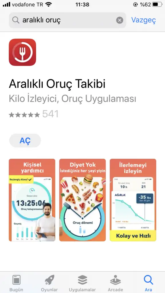 Oruç takıbi ıphonede diğerlerinde adı nedir bilmiyorum canım ama benzeri de olsa vardır mutlaka saat takibi konusunda çok iyi bide vücutta ne olduğunu söylüyor ben şimdi 18 saati devirdim yağ yakma başladı diyor istediğin saatte durdurabiliyorsun oda güzel