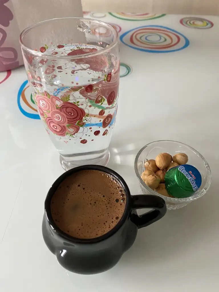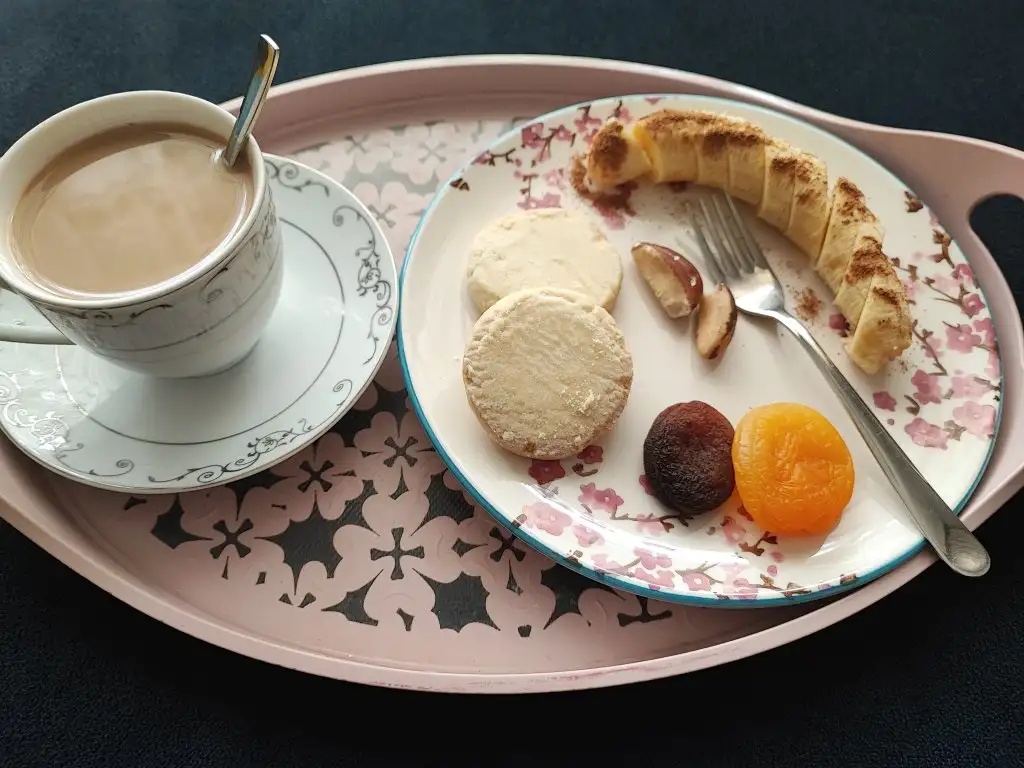 1 fincan Nescafe, 1 küçük tarçınlı muz, 2 Brezilya cevizi, 2 kuru kayısı, 2 un kurabiyesi