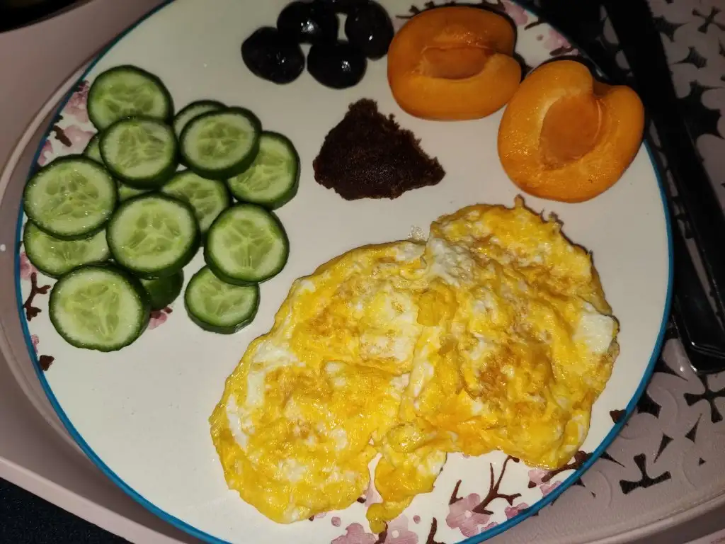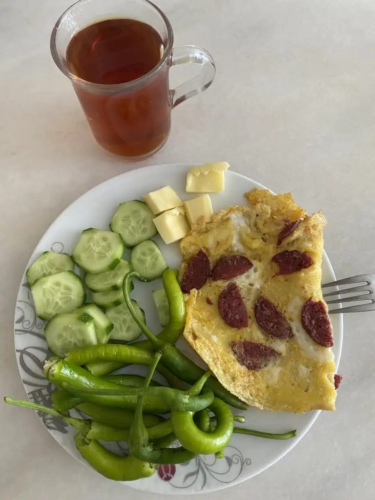 1 sahanda yumurta, 5 zeytin, 1 salatalık, 1 tk hurma ezmesi, 1.5 dilim ekmek, 1 kayısı
