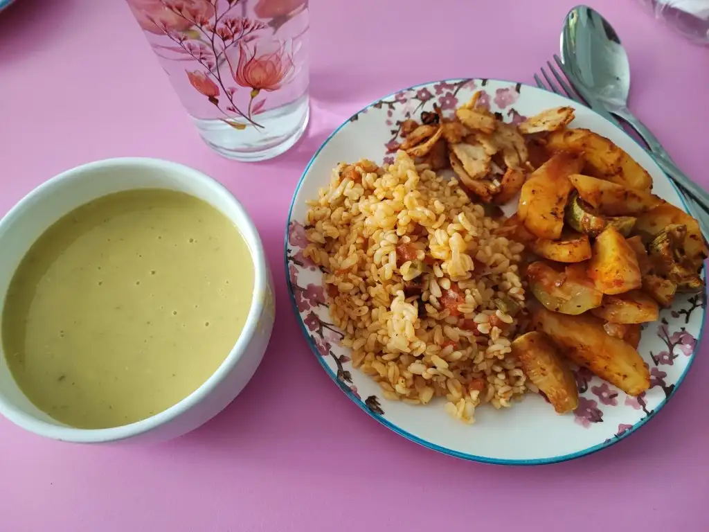 1 kepçe mercimek çorbası, 5 6 kaşık fırında sebze, 4 5 kaşık sebzeli bulgur pilavı, 1 kaşık tavuk döner, 1 dilim ekmek