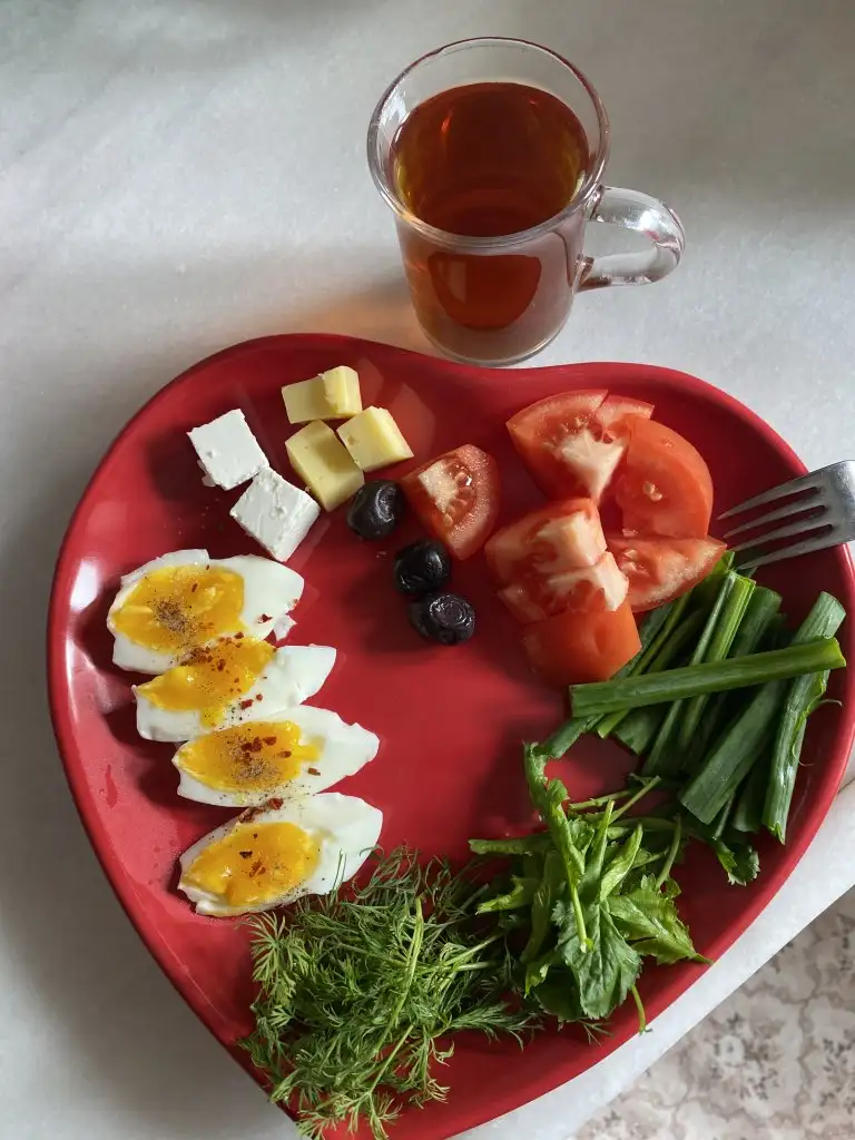 Sabah: hem kaşar hem beyaz peynir kibrit kutusu kadar her ikisinde, 6 tane zeytin, 1 dilim ekmek ve sebze