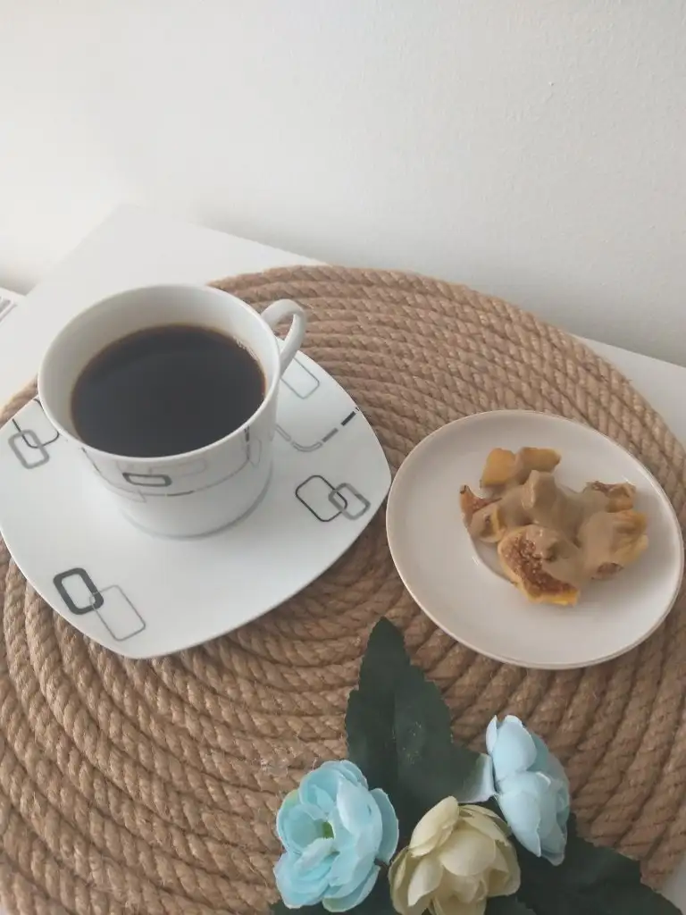 Sade nescafe, 2 kuru incir, 1 yk tahin