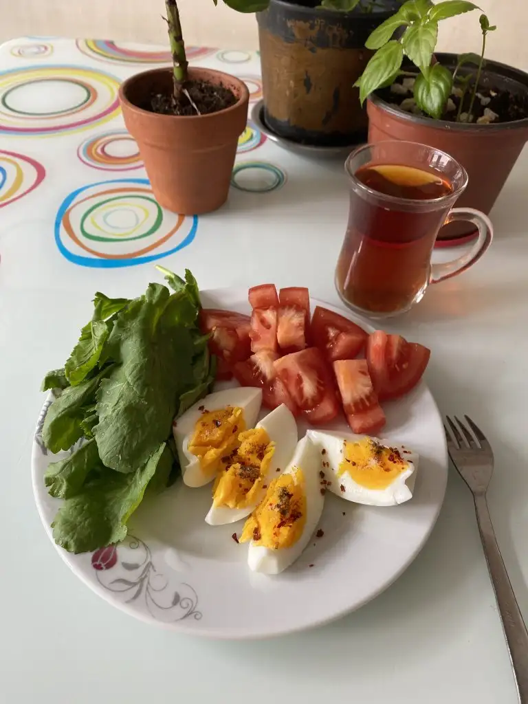 Sabah: 2 haşlanmış yumurta, 6 zeytin, biraz beyaz peynir ve yeşillik domates vs..