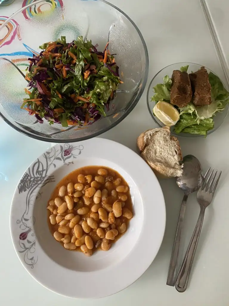 3 yk pirinç pilavı, 4 yk susuz kuru fasulye, 1 kase yogurtlu mor lahana