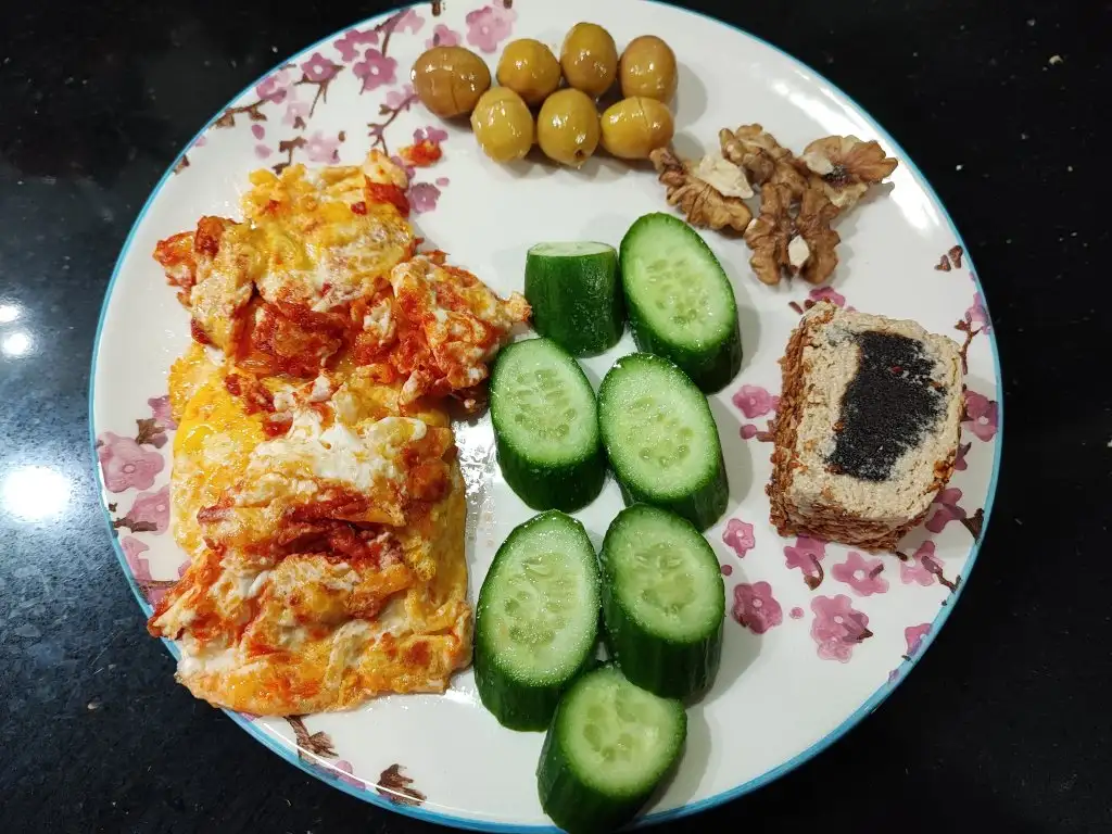 1 sahanda salçalı yumurta, 7 zeytin, 1 salatalık, 2 dilim tam tahıllı ekmek, 2 ceviz, 1 küçük parça hurmalı helva