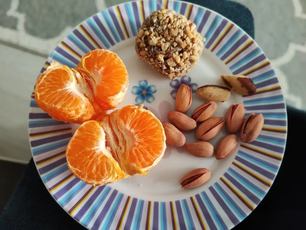 1 mandalina, 1 fındık ezmeli hurma topu, 10 Siirt fıstığı, 2 Brezilya cevizi