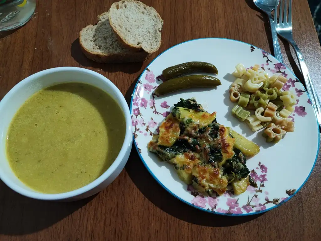 1.5 kepçe sütlü sebze çorbası, 1 dilim patatesli ıspanak graten, 2 kaşık makarna, 1.5 dilim tam tahıllı ekmek