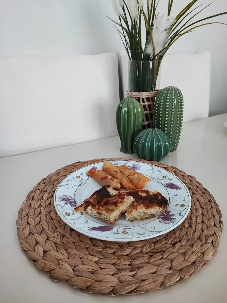 2 İnce ve küçük dilim pırasalı börek, 4 tane lahana sarması, 1 bardak meyve suyu