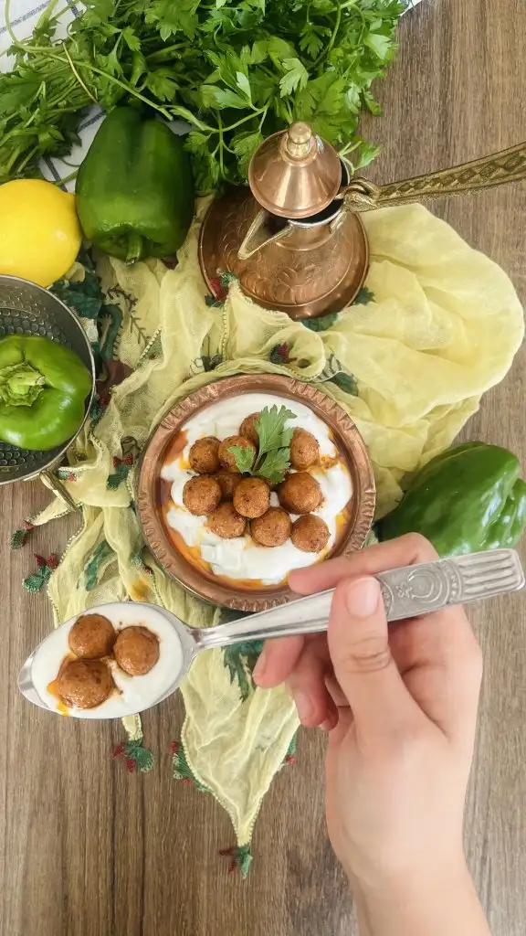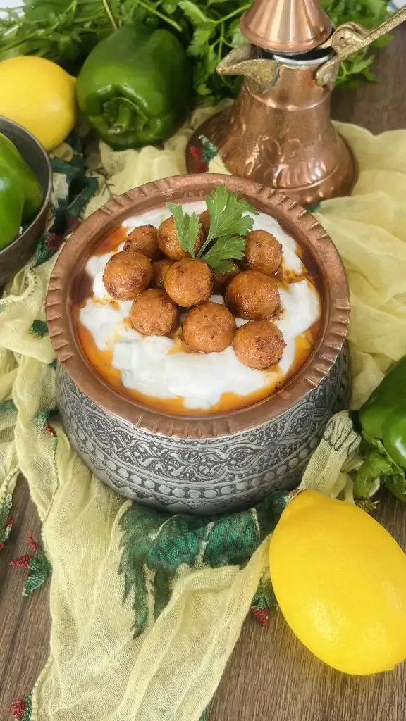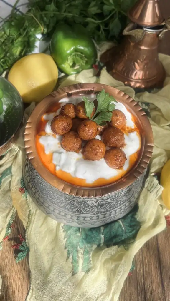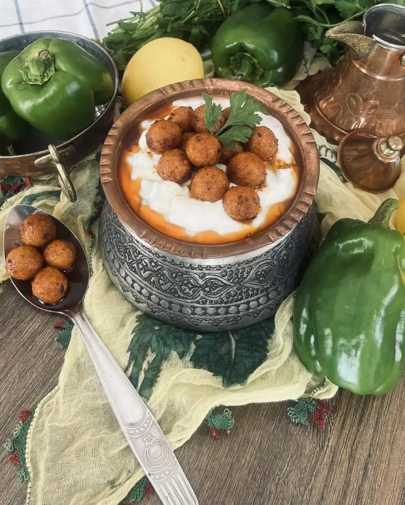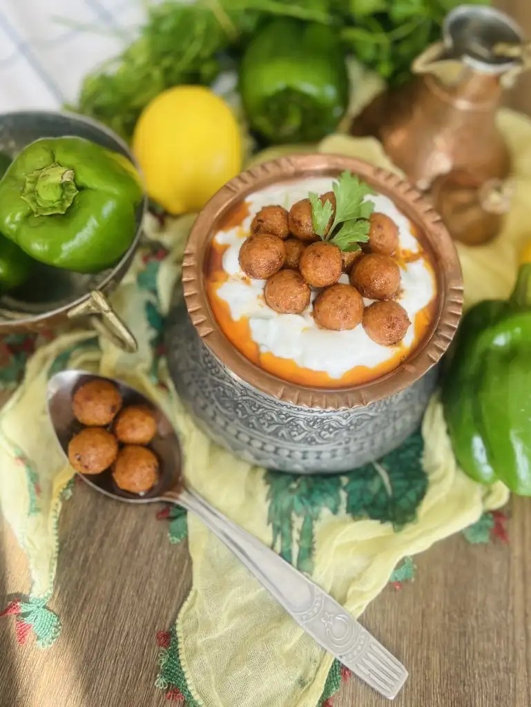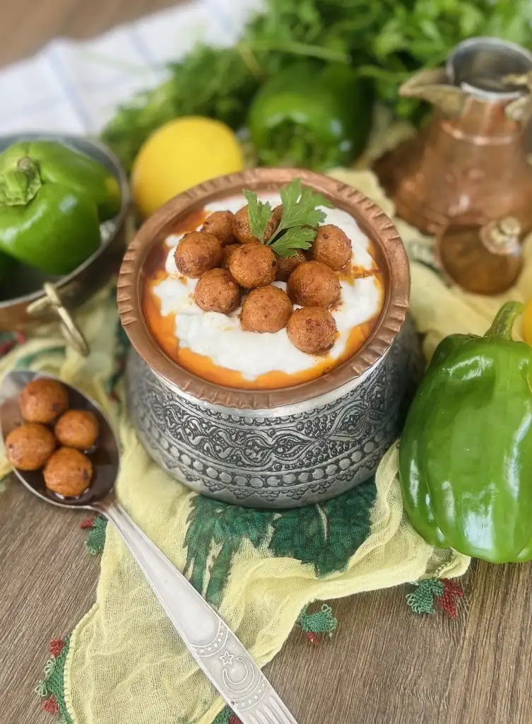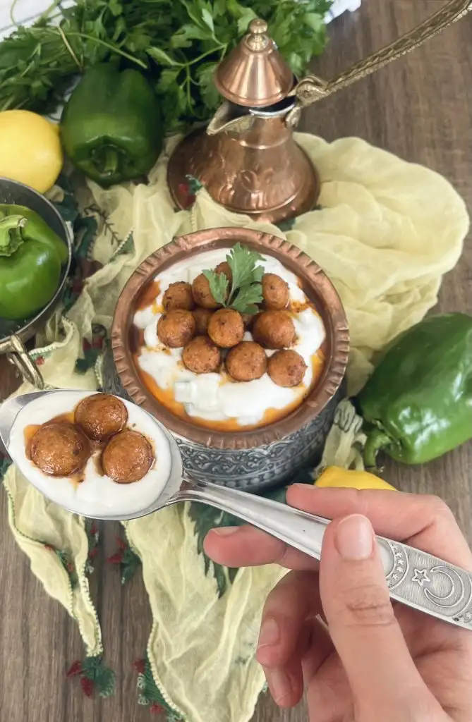 Ellerine emeğine sağlık harika gözüküyor bakır diyarına selamlarGünaydın hanımlar. Bu ay çok sevilen bir yemekle aranızdayım. Aslında birçok yörede benzeri bulunan, Cacıklı Arap köftesi de denilen bu yemek aynı zamanda tescilli bir Gaziantep yemeğidir, Türk Patent ve Marka Kurumu’ndan da mahreç işareti almıştır. Gaziantep’te genellikle yavaş yavaş, buharda pişirilir. Köftesine yağsız kıyma konur, o yoksa patates alternatiftir. Bu lezzetli yemeğin malzemelerine gelecek olursak: