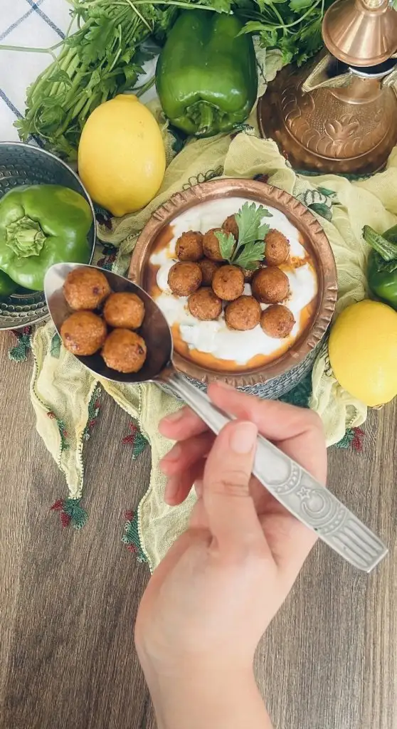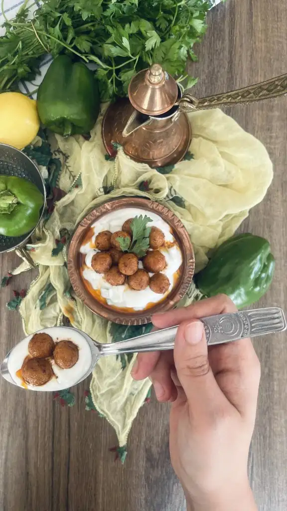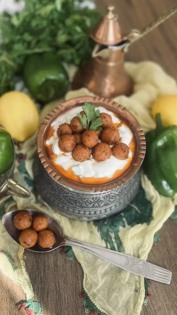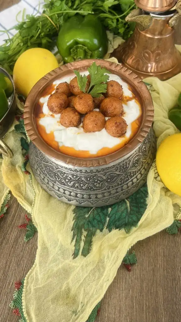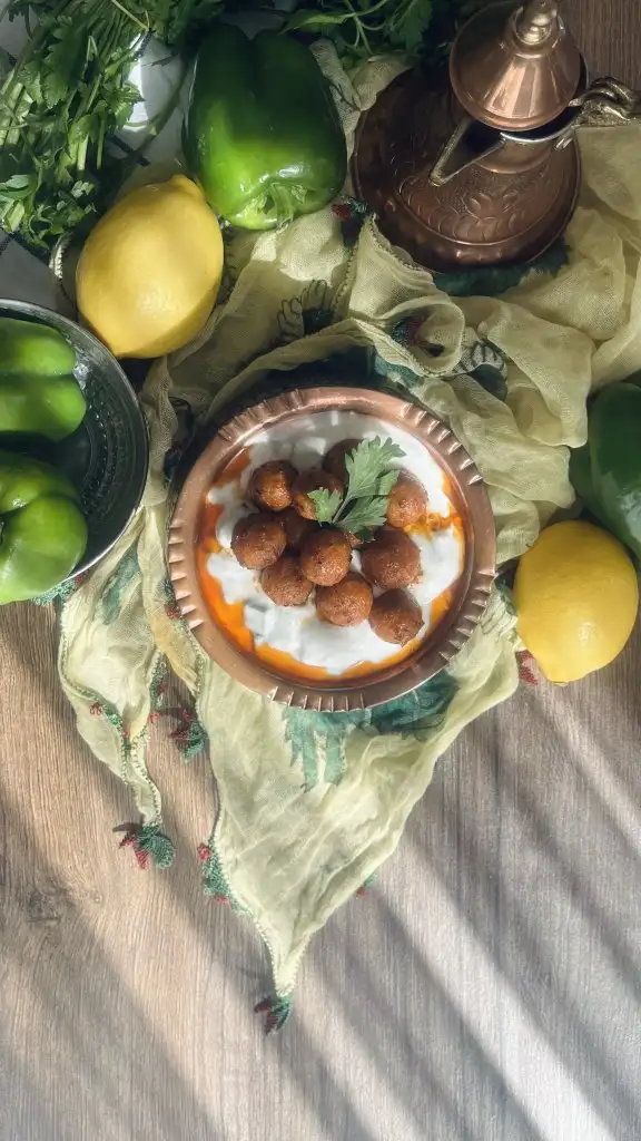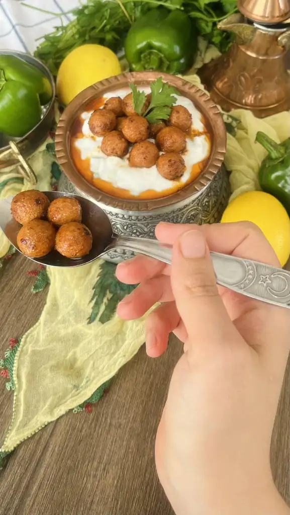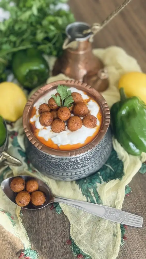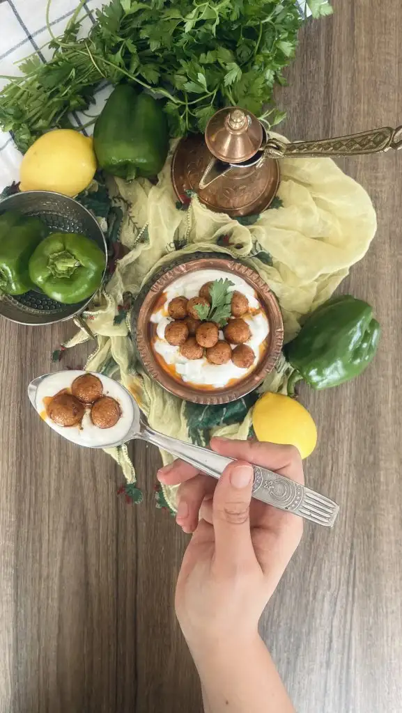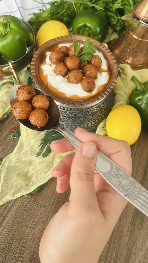 Ellerine emeğine sağlık harika gözüküyor bakır diyarına selamlarGünaydın hanımlar. Bu ay çok sevilen bir yemekle aranızdayım. Aslında birçok yörede benzeri bulunan, Cacıklı Arap köftesi de denilen bu yemek aynı zamanda tescilli bir Gaziantep yemeğidir, Türk Patent ve Marka Kurumu’ndan da mahreç işareti almıştır. Gaziantep’te genellikle yavaş yavaş, buharda pişirilir. Köftesine yağsız kıyma konur, o yoksa patates alternatiftir. Bu lezzetli yemeğin malzemelerine gelecek olursak:
