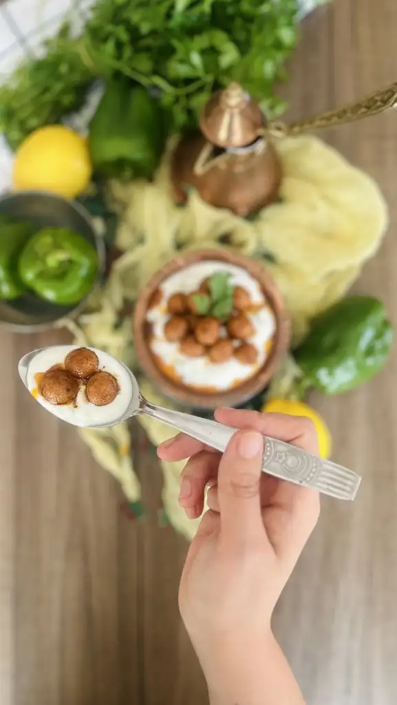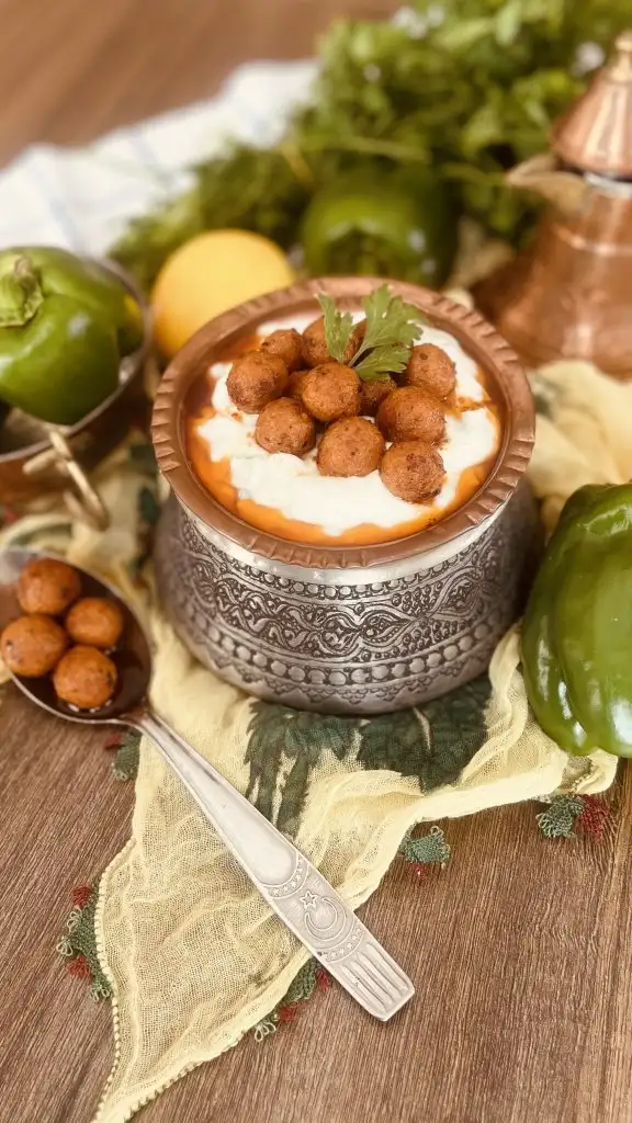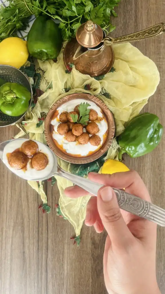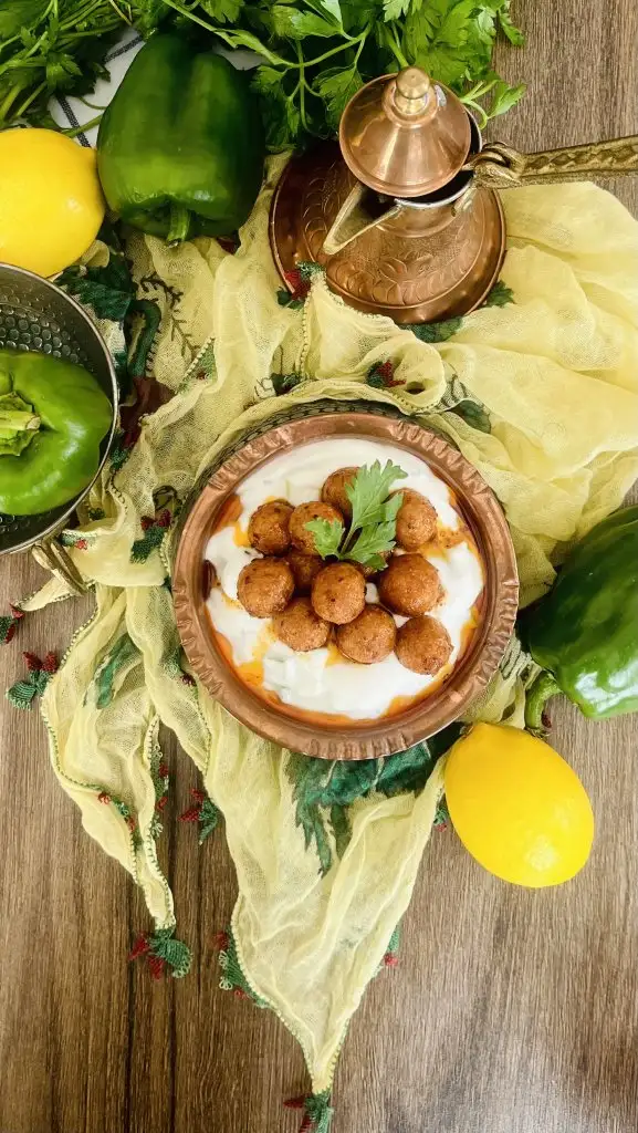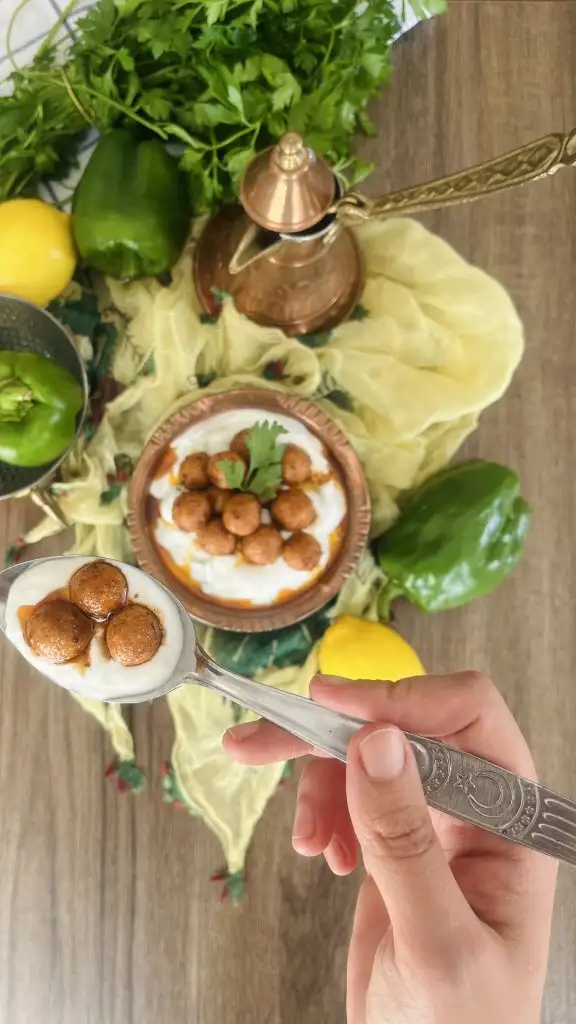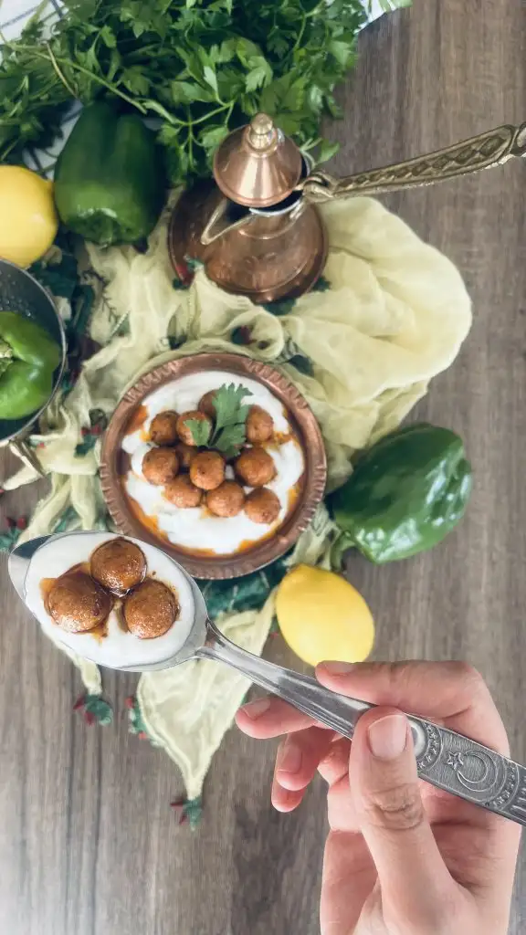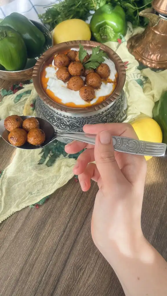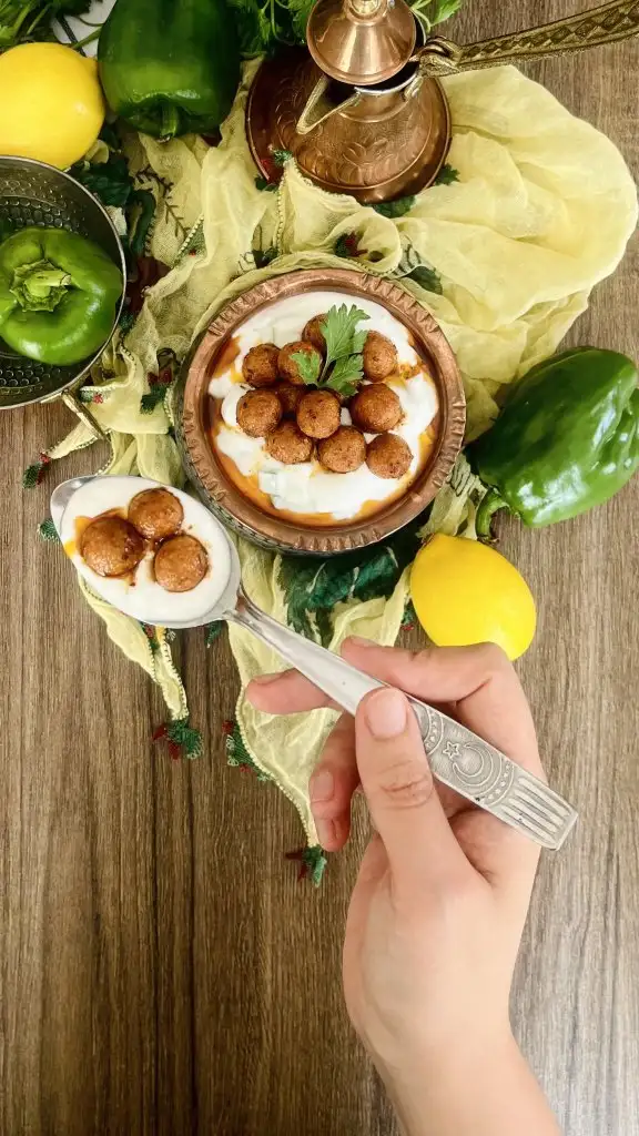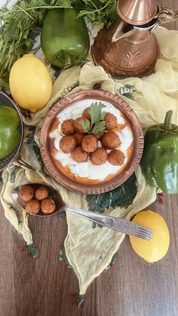Günaydın hanımlar. Bu ay çok sevilen bir yemekle aranızdayım. Aslında birçok yörede benzeri bulunan, Cacıklı Arap köftesi de denilen bu yemek aynı zamanda tescilli bir Gaziantep yemeğidir, Türk Patent ve Marka Kurumu’ndan da mahreç işareti almıştır. Gaziantep’te genellikle yavaş yavaş, buharda pişirilir. Köftesine yağsız kıyma konur, o yoksa patates alternatiftir. Bu lezzetli yemeğin malzemelerine gelecek olursak: