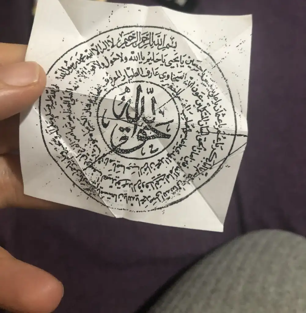 Eşimle aramız çok kötü nefret eder gibi bakıyor bana bi tartışmamız oldu haksız olduğu halde yüzüme bile bakmıyor. Eşyalarımı topluyordum az önce babamın evine gidicem. Çekmecede muska gibi katlanmış arapça yazı buldum anlayan varsa lütfen yardım etsin