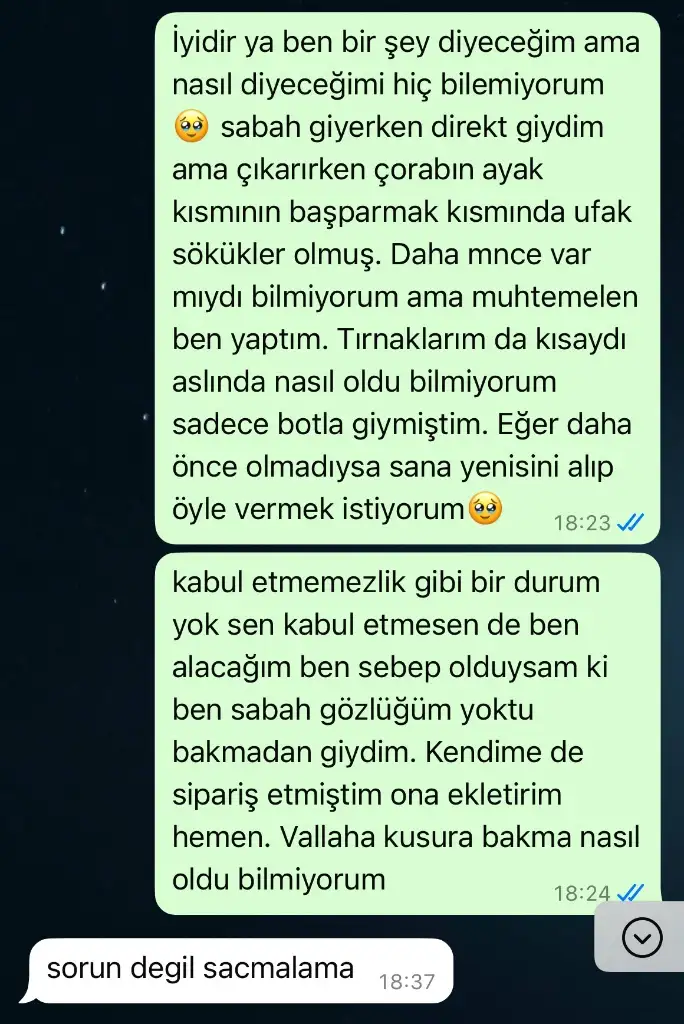 Merhabalar ben üniversite öğrencisiyim yurt oda arkadaşımdan bu sabah şu polarlı çorabını istedim çorap dediysem adı çorap normalde kapkalın bir tayt, elbisenin altına kendi taytımı giydim üzerine de arkadaşımın ten rengi görünümlü taytını giydim kötü durmasın diye, hem ten gibi duruyor hem de ben kendime sipariş etmiştim normal tayt gibi ya yıkayıo veririm diye (garip gelecekler olabilir ama birbirimizin kıyafetlerini alıyoruz zaman zaman) ben giydiğimde ayak kısmına bakmadım ve direkt botla giydim yurda gerş geldiğimde her iki ayağımın baş parmak kısmında sökük vardı tırnak uzayınca çorap kaçar ya. Tırnağım da uzun değildi nasıl oldu anlauamadkm.