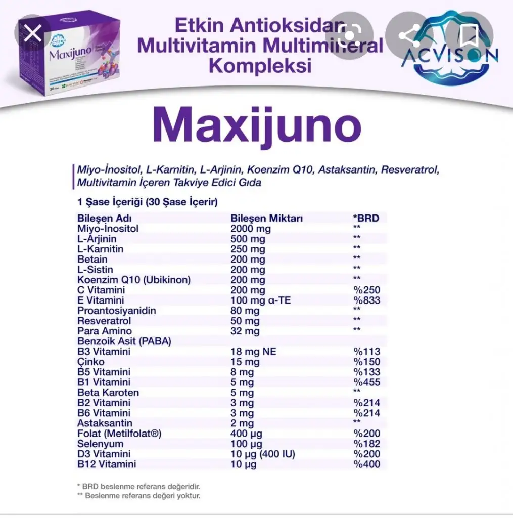 Bu arada eger kullanirsan icinde d vitamini folik asit de var su an kullandigin her neyse ikisini birlikte kullanma fazla doz olmasin sadece maxijunoyu icersinDeneyeyim canım çok sağolasın bu ay da bu vitamini kullanayım başka bir şey yapmıcam. Diğer aya ovülasyonla takip edicem kendim sonrası Allah Kerim