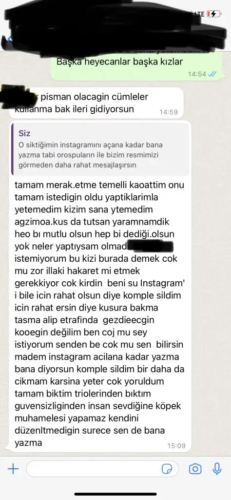 Aynı işyerinde çalışıyoruz. Sürekli beraberdik akşam evde öğlen evde yemekte sürekli her şeyimizi paylaşıyorduk. Bana yakınlaşmaları Azaldı zaten istekli biri değildi . Dün bana ve arkaşıma tiyatro bileti almıştı çok güzel bi akşam geçirdik. Sonra eve geldim instagramına bakayım istedim genç ve güzel bi kız eklemişti 1 senedir hiç hareketi olmayan çocuğun sorduğumda eski stajyer kızlardan dedi ve anında sildi . Daha sonra gün içinde konuyu uzatmaya devam ettim kufur ederek ama maalesef bunları bana yazdı . Bir daha yazmayacagına adım kadar eminim .o benim yazdığıma cevap olarak artık triplerimden bıktığını söyledi . Gerçekten acı çekiyorkm . 1 senelik yaşanmışlıklarımı ve bu şehirde yapayalnızlığımı nasıl olacak ne yapacağım sevseydi böyle yapar mıydı ? Neymiş saygısızlığa gelemiyormuş