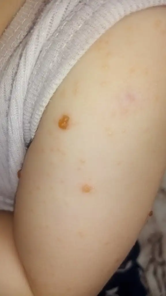 Ben 13 yaşında su çiceyi çikardim ayni böyleydi icersi su oluyor.Bedenin her yerinden çikiyor doktora gitdik su çiceyi oldugunu söyledi hepsini patlatmamizi söyledi ve ilaç verdi hepsinin üzerine sürüyorsun benekli oldum resmen.😁