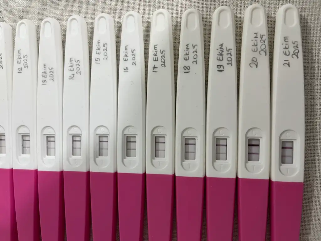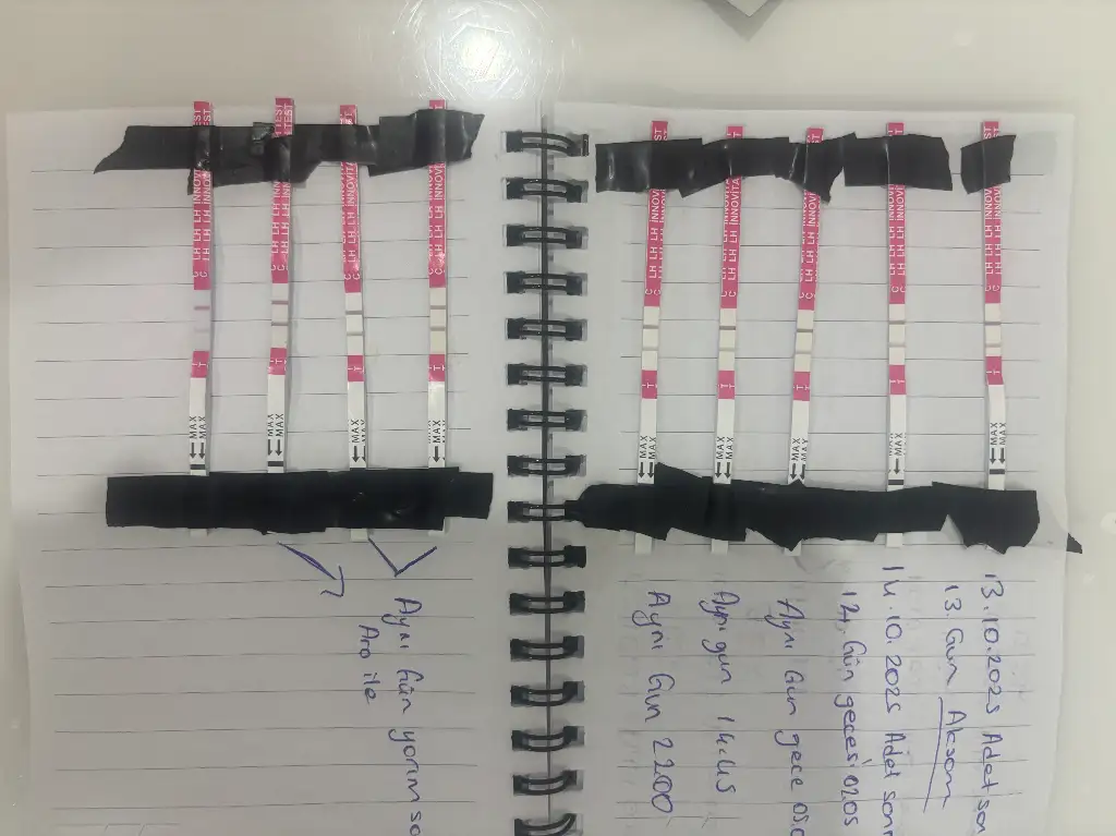 Arkadaşlar merhaba ben düzenli 28 günde bir adet gören biriyim. 4 aydır gebelik deniyorum 3 ay olmayınca eşime spermiyogram baktırdım ileri hız gayet iyi çıktı. Morfoloji %10 ondan sorun yok. Bu ay ovulasyon testleri deneyeyim dedim adet bitimşnde başladım gayet silikti ama hiç pik olmadı 12 gün bi yükseldi ama pik yapmadı. Saat olarak uymadım testlere. O arada pik yapmış olabileceginü düşünüp her günü o 3 günü degerlendirdim. O sürede silikleşme hafif oldu ama tam silikleşmedi kadın doguma gittim ultrasonda yumurta olmadıgını söyledi dün öğlen. Ama testim sanırım bu gün yine koyulastı hatta pike en yakın hali. Kafam allak bullak oldu. En sonda yazmadıgım testi az önce yaptım ve sıvı alımı olan hali. Edetime daha 10 gün var bu gün sın 3 testi yaptıktan sonra silikleşti. Ama yumurta yoktu ki