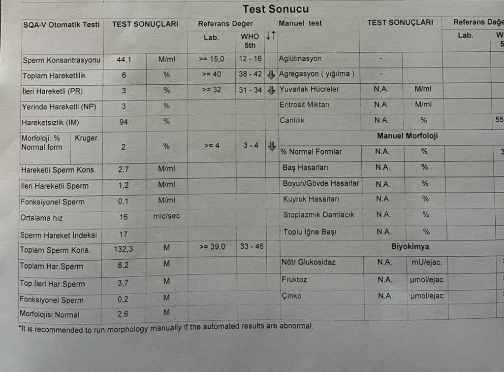 Yani şu an bize de aynı vitamini verdi bu vitaminlerin içeriğine baktığınızda zaten bu vitaminlerin içeriğinde kötü bir şey yok hep vitamin takviyesi yani vitaminini insana ters tepmez yani çok şey olmayan bir insana hani bilmiyorum gene genetik problemli ne bileyim hasta o vitamin vücuduna iyi gelmeyen hani ender insanlarda olur hani yanlış ifade etmiyor durum inşallah hani ama ya genel anlamda bunlar bir vitamin insan vücuduna zararı olan bir şey değil ya bu normal sperm için kullanmayan hastalar da var yani günlük sağlığı için günlük iyi hissetmek için söyliyim vücudunu iyi hissetmek için kullanan insanlar da var gerçekten yorgunluk için uykusuzluk için stres için o yüzden yani şunu demek istiyorum tek vitamine bağlama bunu sen bir önce eşine üç defa veya en az iki defa bir daha teste tekrarlayın bir daha tekrarlayın bakalım bu kez ne çıkacak bu kez de yine bu son çıkan düşük değere yakın çıkarsa demek ki düşüktür deriz eğer ki yüksek çıkan değeri yakın çıkarsa demek ki deriz yüksek yani ortalama hem düşük hem yüksek arası bir şeyleri zaten o yüksek olan da yüksek değil o da düşük sayılar yani bu aradaki 2.03 fark önemsizdir nasıl ki Amh hormonu sıfır, sekizle 0,7 0,10 ya bunların arasında ve mesela nasıl fark yok nasıl Laboratuvarlar hep böyle sıfırları değişik çıkarıyor bence hiç fark yok bu değerlerin arasında çok büyük elzem bir fark yok ki en azından sıfırla iki arası gibi gibi fark yok bunlar laboratuvar bu şekilde değişik çıkarabildiği gibi beşmiş Onmuş altıymış ya bu değerler de bence önemsiz yani totalde zaten düşüp yüksek çıkan da düşük düşük altı çıkan da düşük 15 çıkan da düşük sizinBizede vitamin verdik proxxed plus 3 ay düzenli kullandı eşim ileri hız 18 den 6 ya düştü maalesef