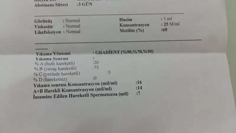 Benim ki tutar inşallah canım Allahin ne zaman vereceği belli olmaz tek sperm yetiyor yumurtayı döllenmeye benim içimde hep umut varTest sonuçlarını çok anlamıyorum ben ama benim eşimin spermi yıkandıktan sinra 26 milyon vardı sanırım doktor da yeterli ve iyi demişti ama nasip olmayınca olmadı sonra ki ay kendiliğinden geldi