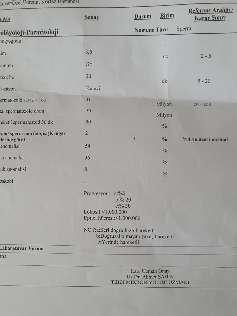 merhaba arkadaşlar öncelikle Allah herkese bebeğine kavusturmak nasip etsin ben 33yasindayim 8 aydir cocuk düşünüyoruz son 2 ay doktora gittim amh değeri 1.29 cikti hsg rahim filmi çekildi doktor isterseniz aşılama yapalim değerlerinin biraz düşük dedi sonra esim sperm örneği verdi biraz düşük çıktı asilama öncesi spermlerde oyle bugun asilamanin 12.gunu ama 2 gün önce beta hcg testi 1.29 çıktı ama eşimde prodexx plus kuenzim10 ve evitap e vitamini kullanıyor sizce 2.asilama yaptirmalimiyim yoksa bekleyip doğal yolla olmasını mı bekleyeyim bu arada sperm değerleri ekliyorum sizin nasildi?