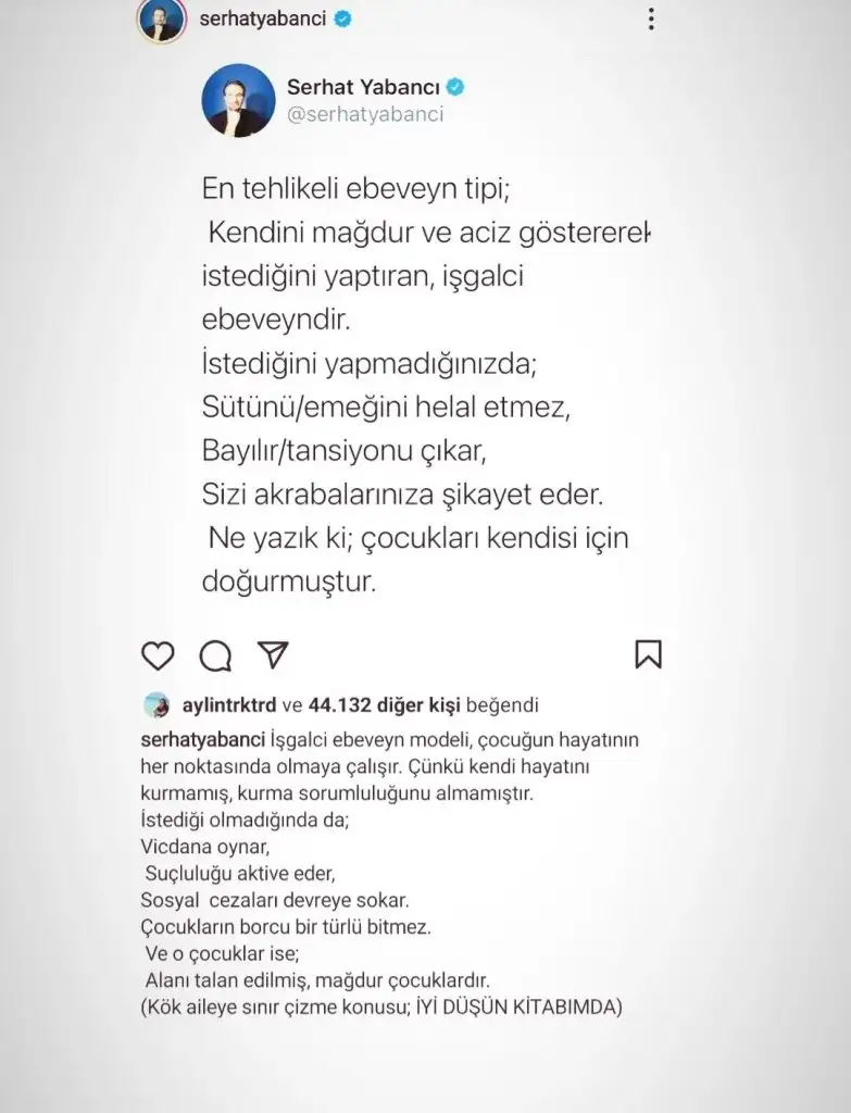 İlk etapta ben de sizin gibi düşündüm.Hatta kizdim biraz,cunku ortrada bir sorun varsa konuşulur.Boyle şeylere gerek yok.Ama düşündüğümde de ilk defa böyle bise yaptı.Surekli böyle davransa acitasyon yapıyor derdim. Düşünüyorum evet o da yıprandı kendi hatası olsa da tamamen.Ailesi kolay bir aile degil hepsi problemli çünkü.. Kendi bana kiz kardeşimin psikolojik sorunları var,babam depresyonda,annem zor bir kadin demişti.Tabi bunu önceden söylemiyor evlendikten sonra ben sorun yaşayınca.Annesi sürekli ne problemleri olursa esimle konuşur,baban bugün yemek yemedi,baban bugün hiç bahçeye çıkmadı,bugün doktora gittim bunu söyledi,kiz kardeşin erkek arkadaşıyla kavga etmiş..Aklımıza gelebilecek önemli önemsiz herşey hakkında esimle dertlesmeye çalışır.Kocasi yerine koyuyor esimi..Esim bise olunca ailesine çok üzülür çok dert eder..Halbuki kp zaten her zaman az yer,çalışan adam zaten her gun dışarda eve geldiğinde bahçeye çıksa ne çıkmasa ne,kiz kardeşi zaten geçimsiz herkesle kavga eder erkek arkadaşıyla tartışmış çok degil yani..Eşinizin ağlarken fotoğraf atması, intihar etmek istediğini söylemesi direkt şov değil mi?