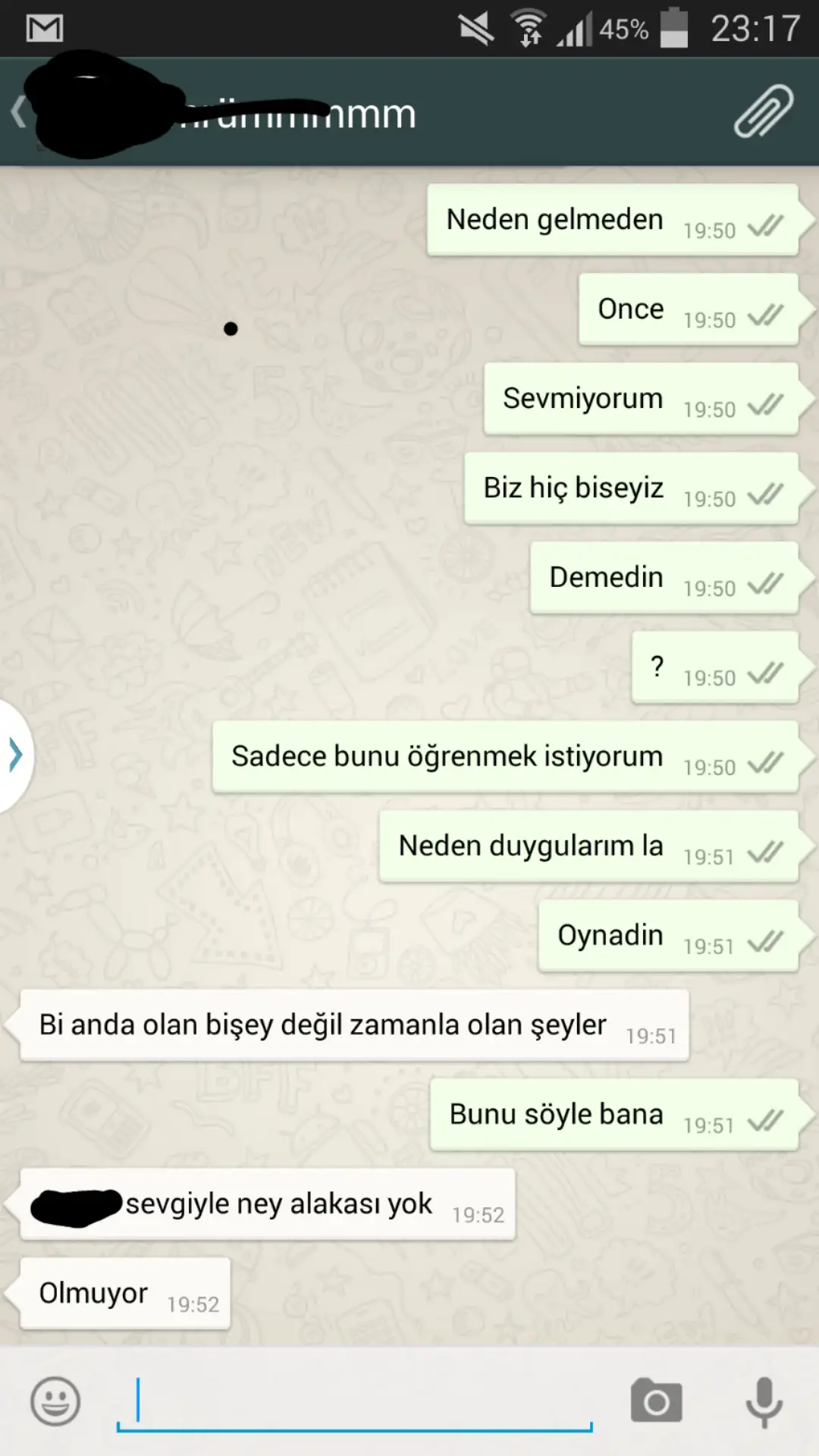 Ya valla okudukca bu yazdıklarını elim kolum titriyor. Katıl olasim geliyor sonra ben ona dedim ki benim cenazeme bile gelme dedim.. whatsaptan engelledim mesaj attı dün hiç cvp vermedim bak onuda atiyim