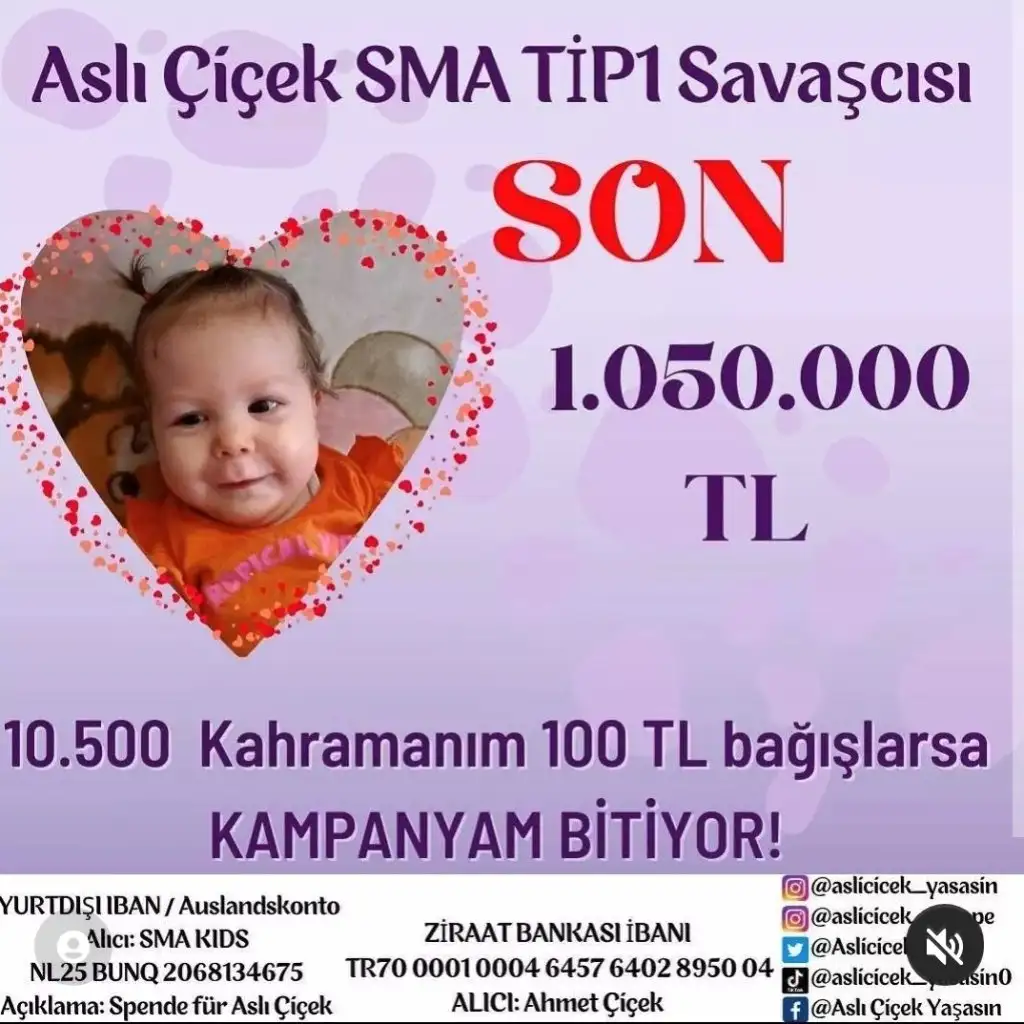 Aslı bebek yüzde yüz oldu galiba insaallah öyledir çok mutlu olduminsaallah yağız bebek ve aslı için çok sevindim adlarına insaallah 100de 100 olur ikisi beraber ilacına kavusur o minik ellerini minik yüzlerini gözlerini anlamlı bakısları beni çok üzüyor insaalah bir an önce kavusur evet yağız bebekte zor durumda rabbim bir an önce ilaclarını kavustursun iyilessinler insallah tüm sma hastalarını ilaclarına sağlığına kavustur allahım safi isminle sifa ver allahım ve diğer tüm hasta bebeklere insanlara ve hayvanlara safi isminle sifa ver allahım cuma hürmetimine kabul et allahım amin amin amin