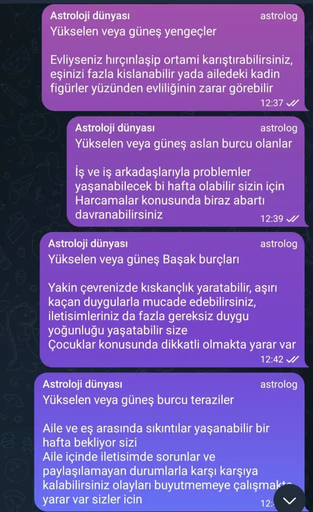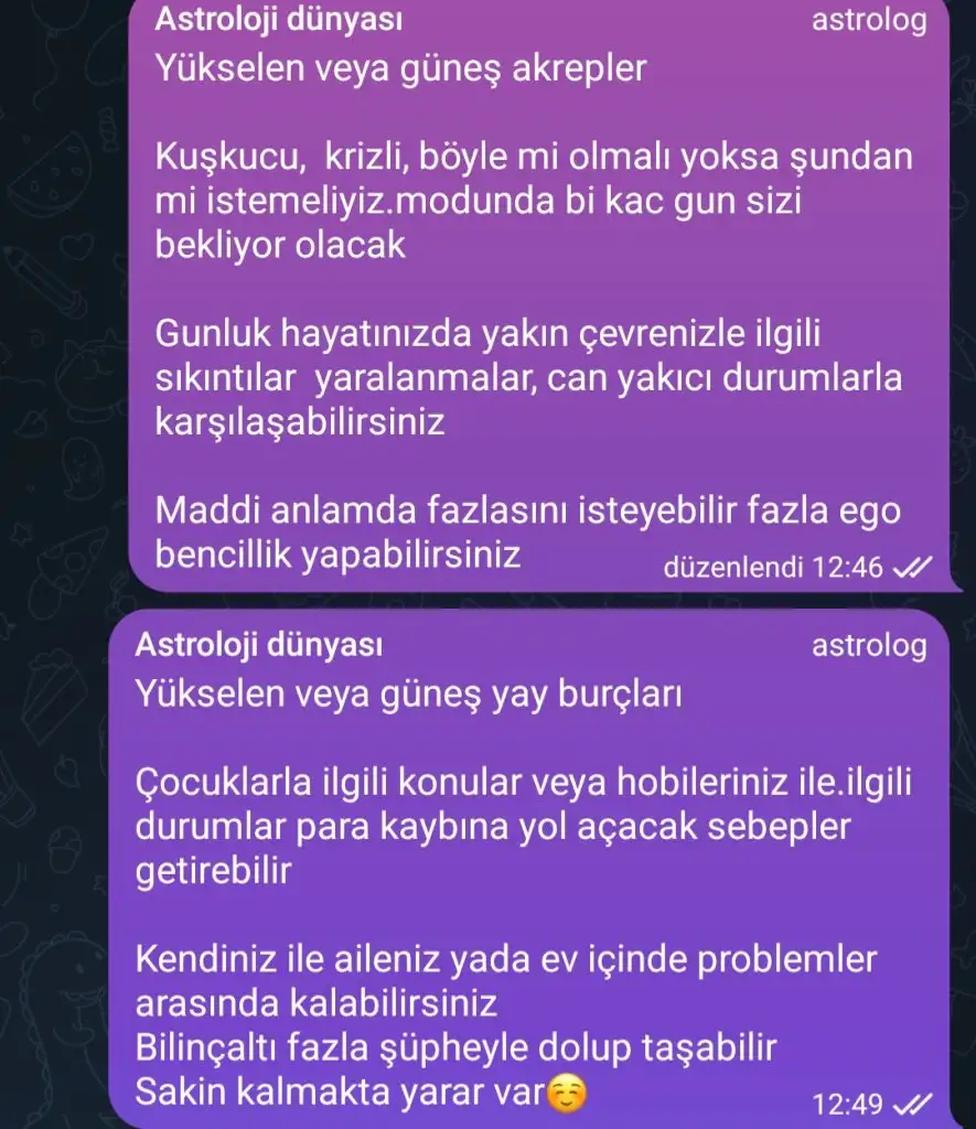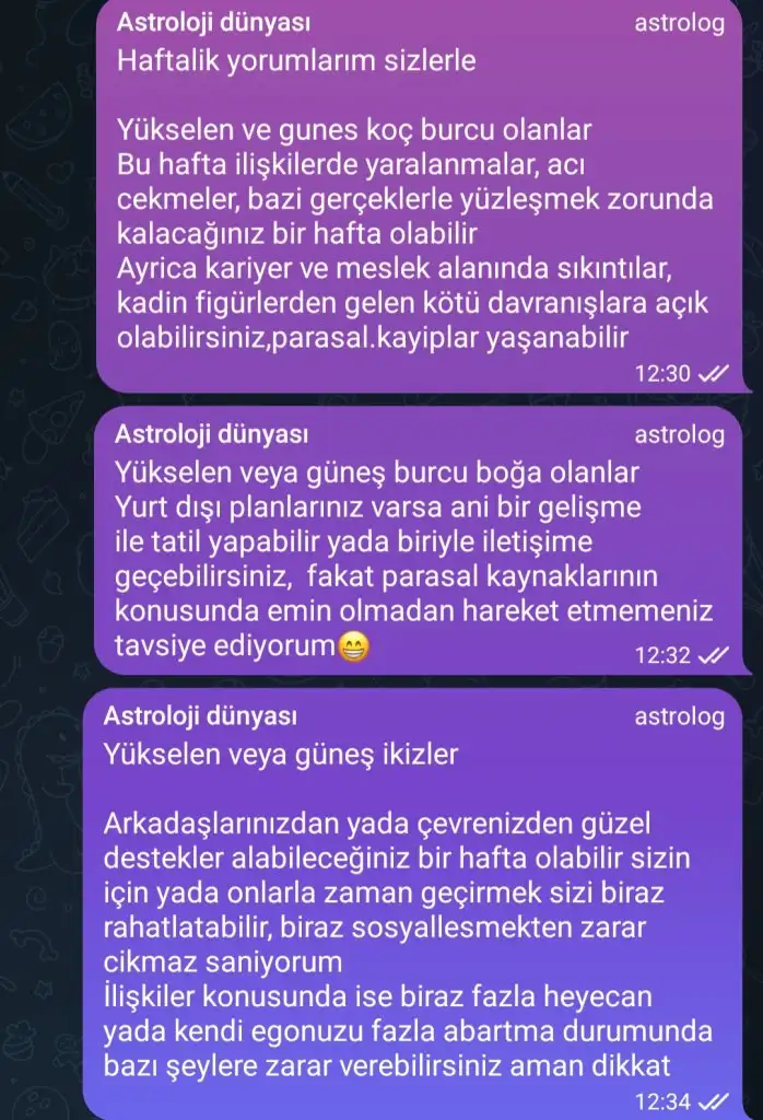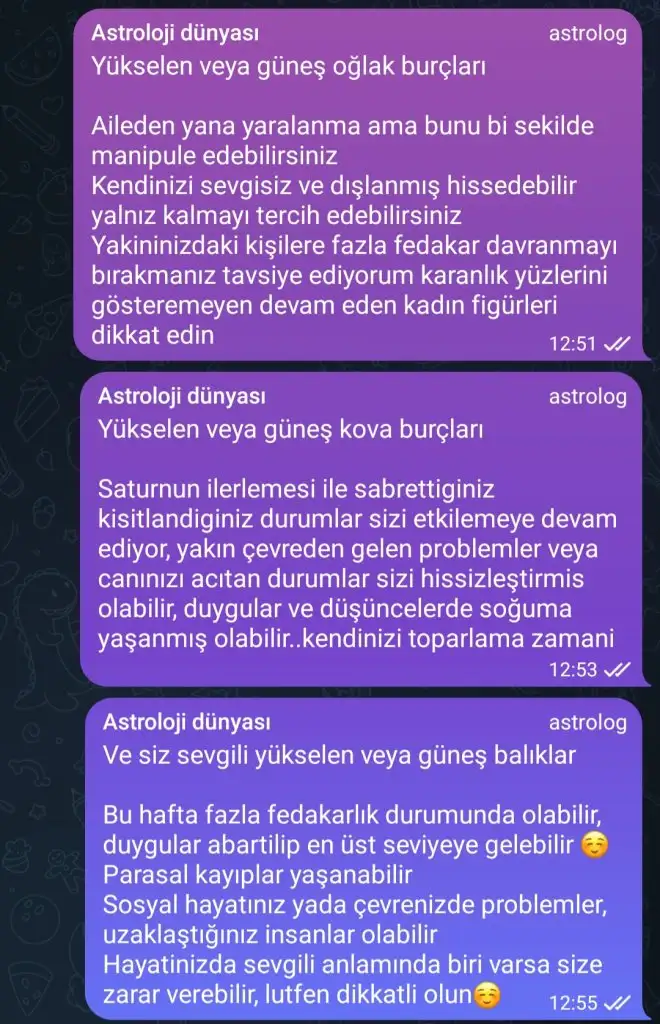 Maalesef ümit basıyorlar ben pek sevmiyorum mesela burc yorumu yapmayi çünkü harita kişiye özel bisey, onun ne yaşaması gerektiğini o gösteriyor, diğer şeyler bana sadece insanları kandırmak gibi gelyrpofu herşeyin niyet ve enerjiyle gerçekleştiğine inanıyorum hatta çekim yasasına da fazlaca inanan bir insanım. Takip ettiğim tarot sayfalarında kollektif okumalar paylaşılıyor. Okuyunca diyorsun ki evet bu beni anlatıyor hatta hayret ediyorsun. Bi bakıyorsun yorumlara senin gibi nice insanlar var. Biraz kafam karıştı .