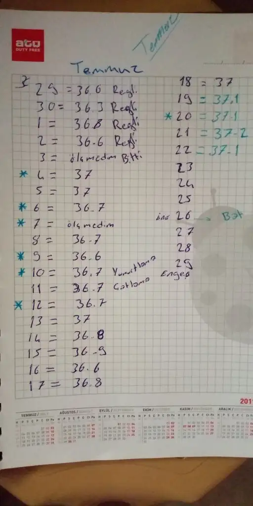 Geçen ay nerdeyse aynı tablom vardı çok heycanlanmıstım ateş derceemiz cok benzıyor benımde son 8-9 günüm hep 37-37.1 di adete malesef 2 gün kala baya düşmüştüEli kulaginda regli olacak gibi agrilarim var bugun hayirlisi bakalimEki Görüntüle 2666385