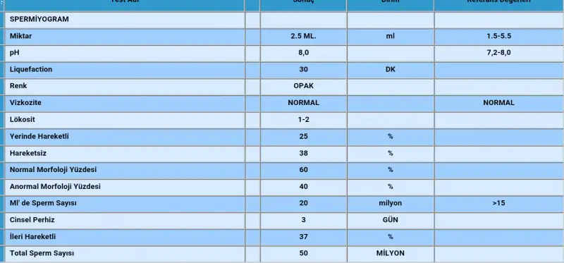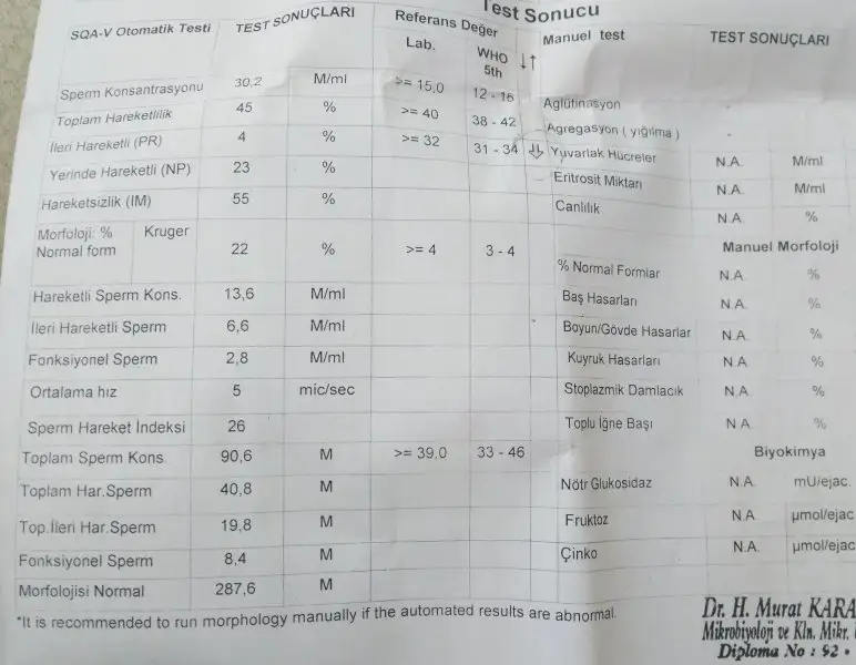 yok canım 60 çok fazla bence whoya gçre bzmki kruger diil çok sağlıklı bi test olduğunu düşünmüyorum ztn ama klomen kullanmadan bakılsın istemiştim büyük bi problem olsaydı azospermi fln çıkardı heralde teste o zaman klomene bulaşmıcaktım boşunaBHC ml de 30 milyon bizim 40 milyon zafrina 20 milyon, BHC ileri hızlı 4 , bizim 18, zafrina 37; BHC total hareketli 45 , bizim 80, zafrina 62 ama BHC de morfoloji 22 bizim birinde 3 birinde 5. zafrina sizin morfolojide oran belirtmemiş %60 diyor ama krugere göre midir bilemedim. çok fazla geldi bizimkilerin yanında