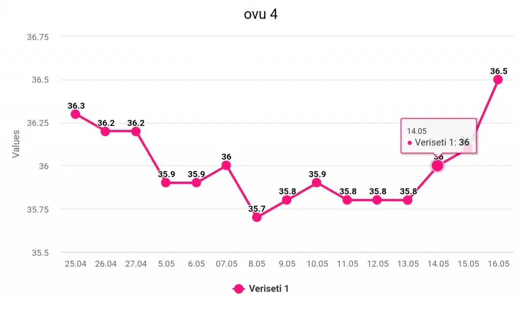 Üzun zamandır kimse yazmamis buraya bende son ateş grafigimi atayim dedim sonra tedaviye basliyorum nasipse 7 mayistan 12 mayisa kadar seffaf akintim oldu buyuk ihtimal bu araliklarda bi gunde yumurtladim. Bakalim ölcmeye devam edecegim 😊 artik kimse atesini olcmuyor sanir 😂