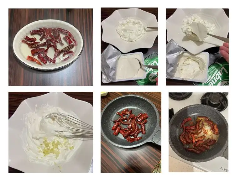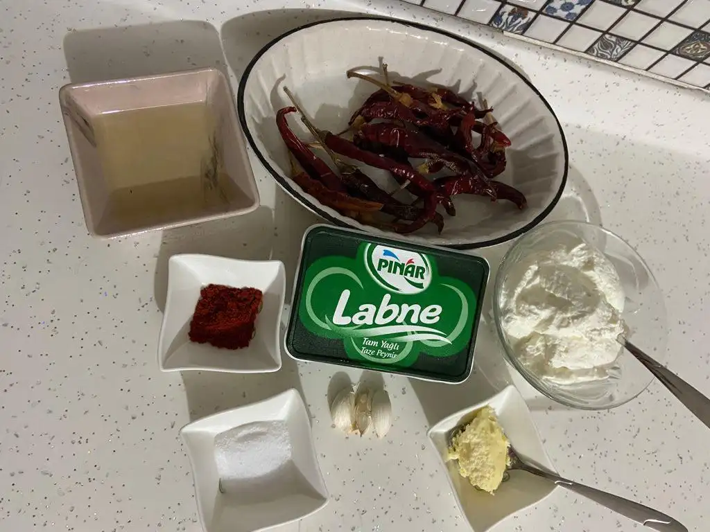 Öncelikle kurutulmuş sivri biberleri ikiye ya da üçe bölerek bir kaseye alıyoruz (Aşırı acı olmaması için ben tohumlarını çıkardım.) ve üzerine sıcak su dökerek 5-10 dakika yumuşamasını bekliyoruz.
