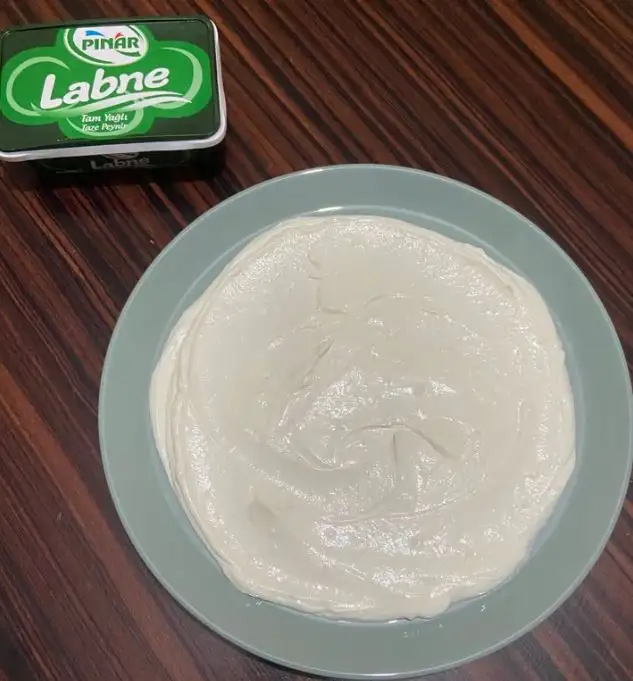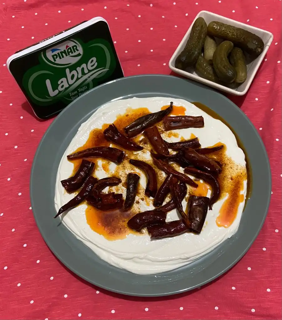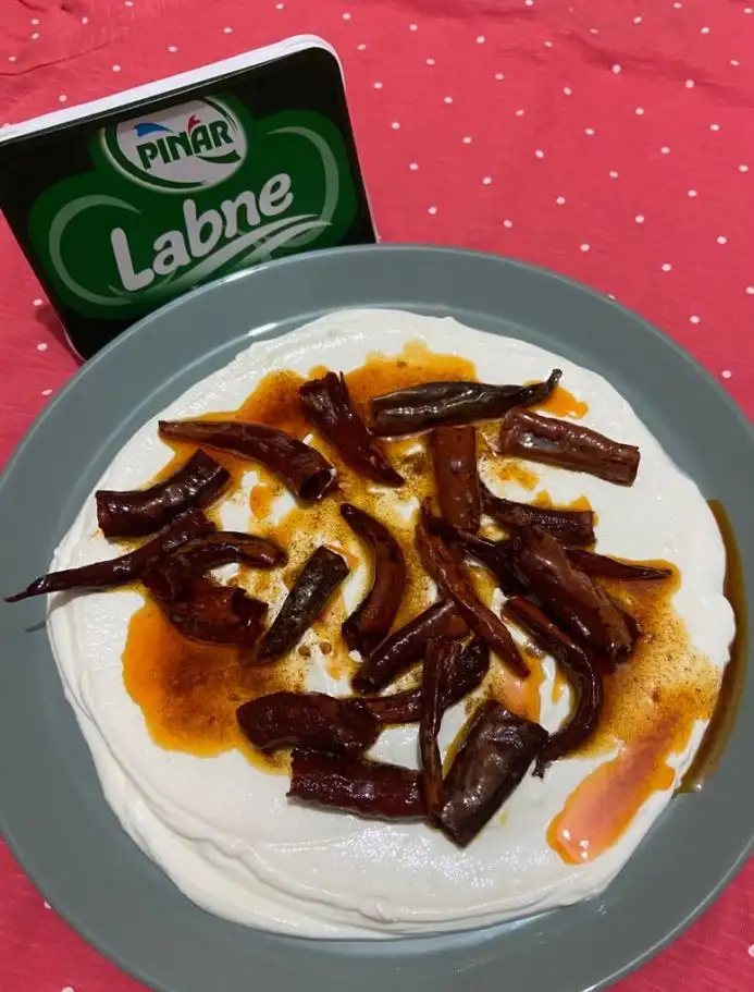 Diğer tarafta bir kaba süzme yoğurt ve pınar labneyi karıştırarak üzerine sarımsağı rendeliyoruz ve biraz da tuz ekliyoruz. Yoğurtlu karışımı tel çırpıcı ile pürüzsüz bir kıvam alana kadar iyice karıştırıyoruz.