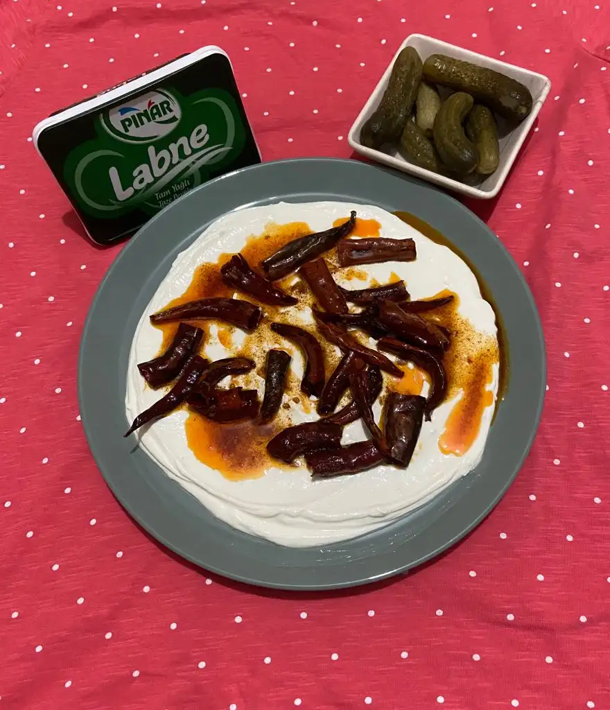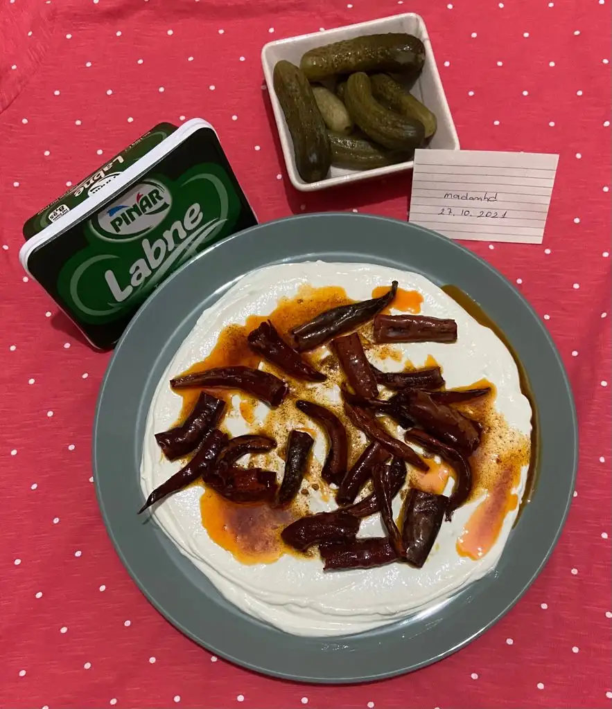 Hazırladığımız yoğurtlu karışımı yayvan bir tabak içine yayıyoruz.
