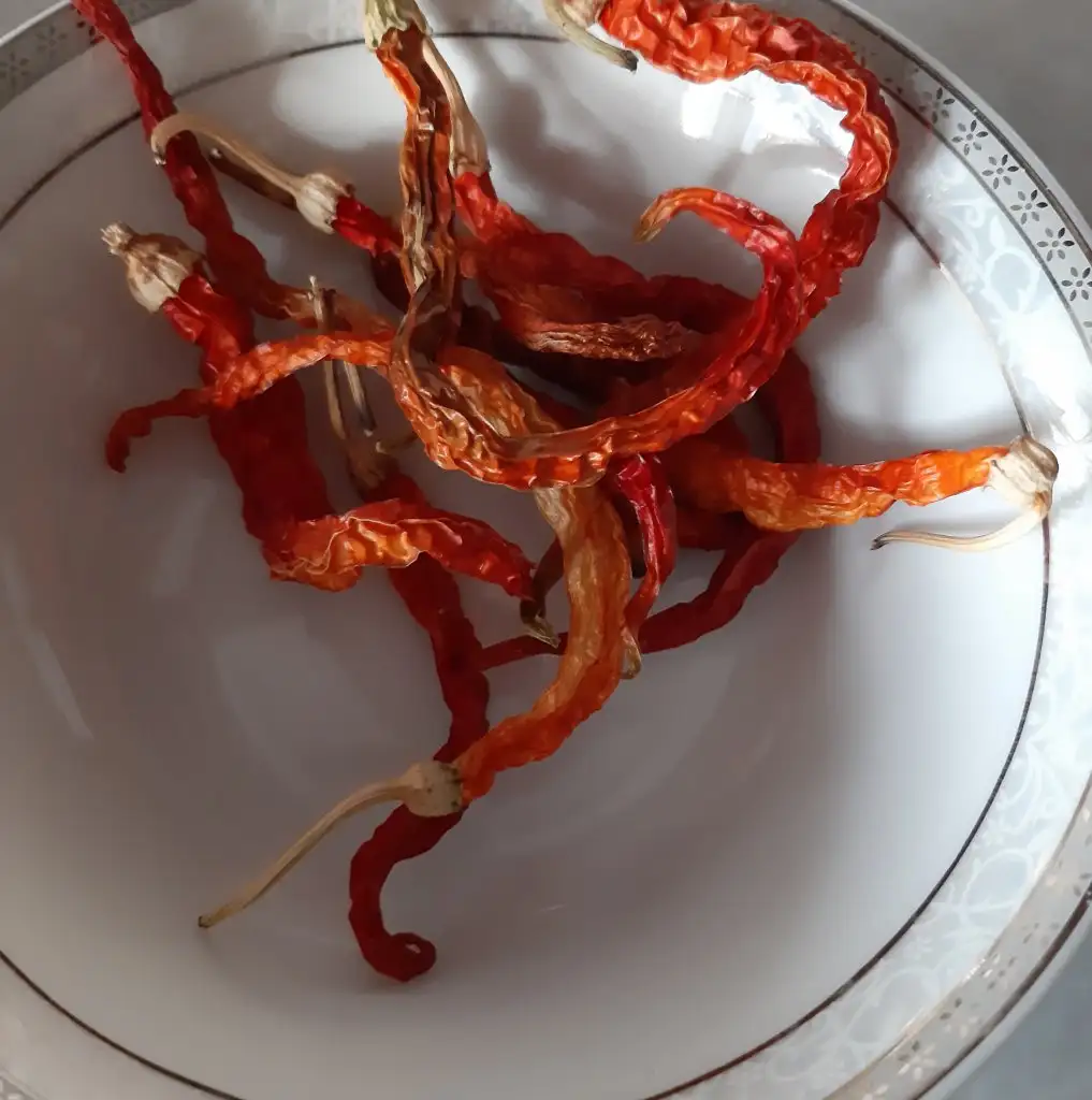 Öncelikle kurutulmuş sivri biberleri ikiye ya da üçe bölerek bir kaseye alıyoruz (Aşırı acı olmaması için ben tohumlarını çıkardım.) ve üzerine sıcak su dökerek 5-10 dakika yumuşamasını bekliyoruz.