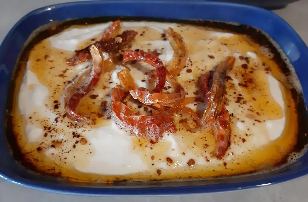 Hazırladığımız yoğurtlu karışımı yayvan bir tabak içine yayıyoruz.